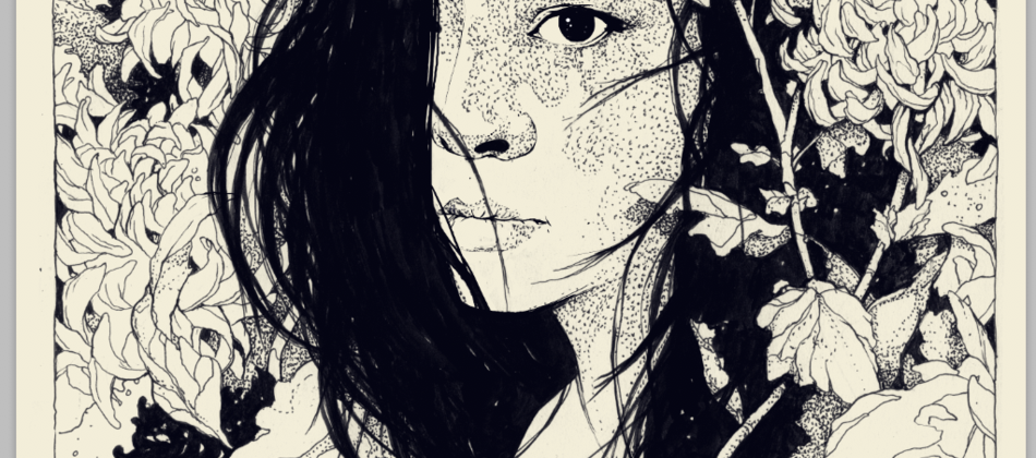 An original framed ink drawing of singer Mitski by Simon Prades. As part of an illustration commissioned by Rolling Stone magazine.