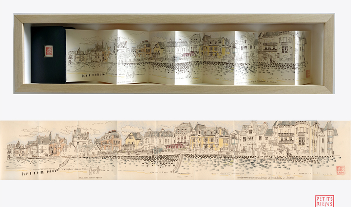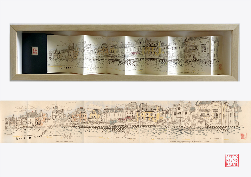 Sepia drawing with pigmented India ink, watercolor’s wax on cream color paper Vivaldi 240 g Leporello 9 leaves 5,51 X 31,88 inches In Bound Book 4,33 X 5,90 inches Framed with natural wood Ayous. 31,4 X 7,67 X 2,36 inches