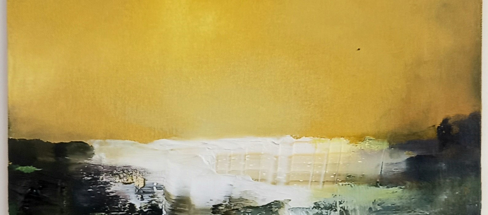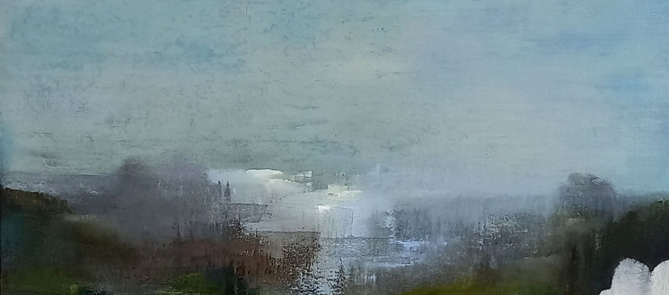 To use the phrase EARTHLAND as the title for this new collection of paintings is to borrow a chapter heading from McFarlane’s Landmarks and I like to think that it has the poetic heft and quality of allusion that I feel about this land across which I walk, cycle and swim. Moors and rivers and estuaries and fields and seas for ever, my body, my mind, our bodies, our minds , our land , EARTHLAND” .