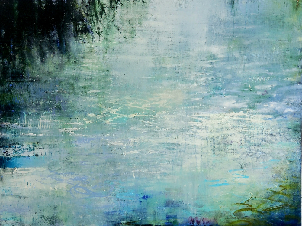 The artist draws us to his recent experience by the river Dart in Devon, when drawing on a stone bridge over the river under the trees overhanging the water. He was sheltering from rain when the whole surface of the water shifted from side to side with the brilliance of light having the effect of drawing the eye and body down the river towards the light; light through willows on water.