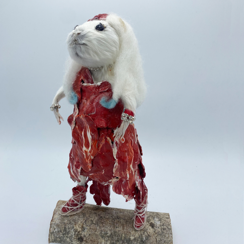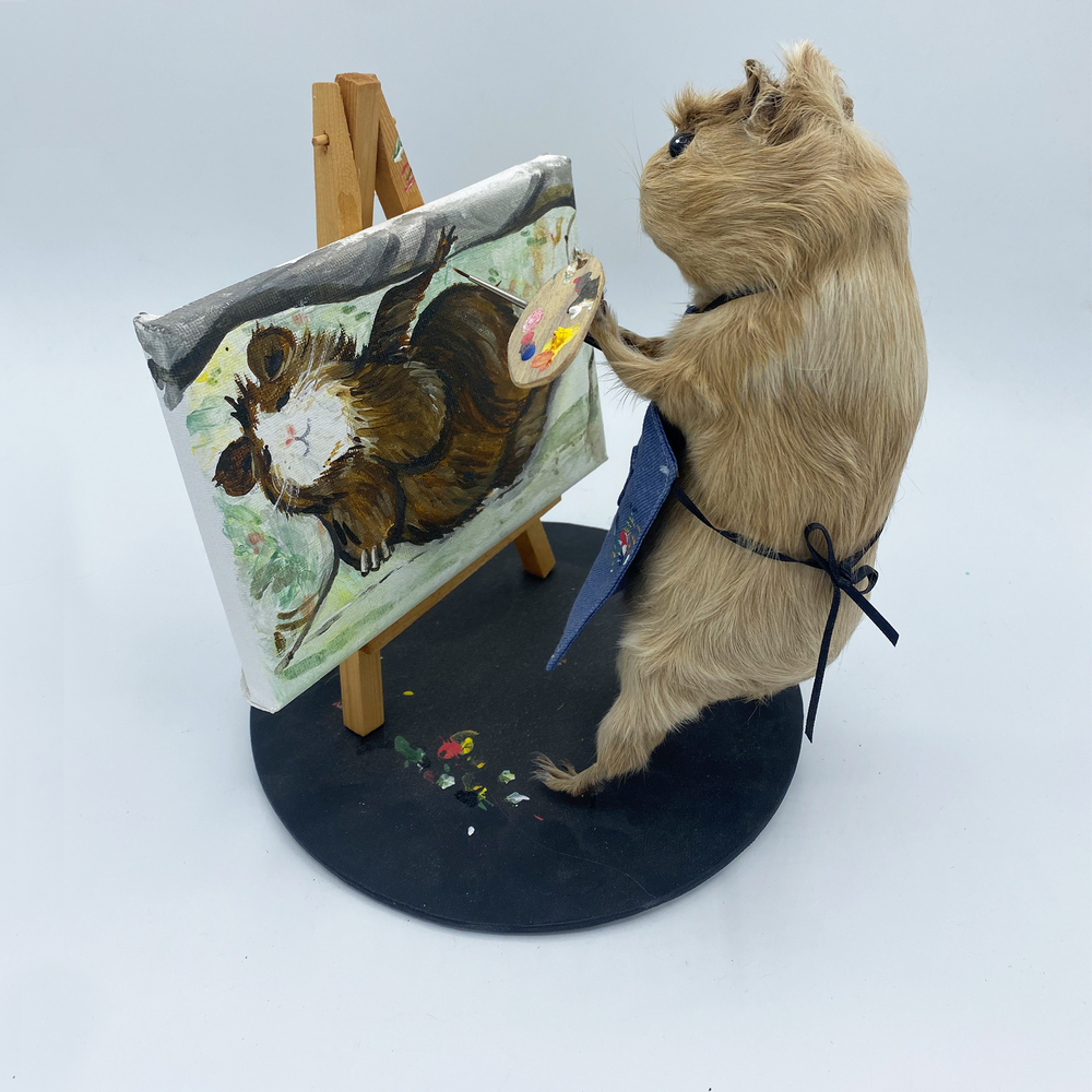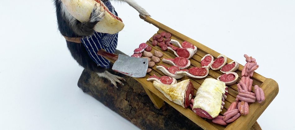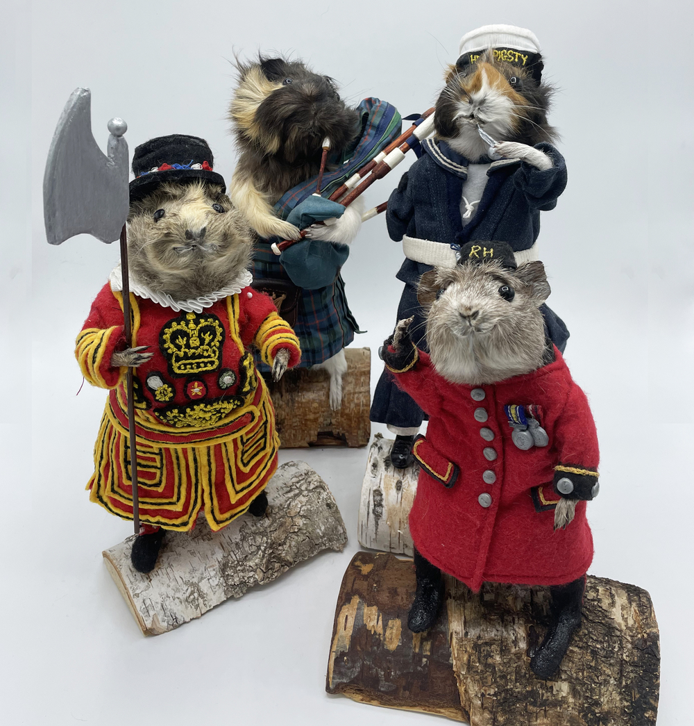 In the guise of Taxidermyjane, Jane Webster welcomes you to her first exhibition of anthropomorphic animals. Jane is an illustrator, educator and researcher who engaged in the craft over lockdown. All animals are ethically sourced from the snake food chain and have been given a new identity through character, costume and observation. Every aspect and detail is handcrafted and created as a unique piece. The ‘We’re all stuffed’ show explores relationships, roles and identity. A crew are putting on the event. Builders, craftspeople, make-up artists, dressers, technicians and caterers support the exhibits.