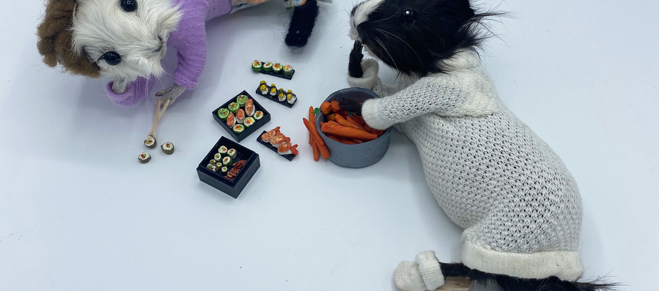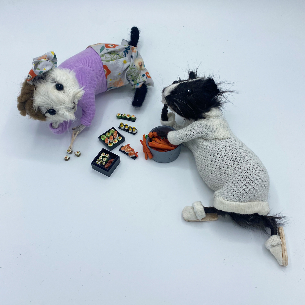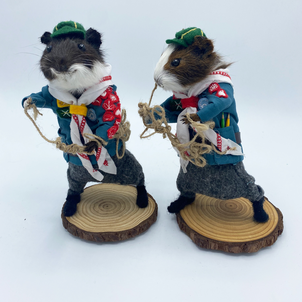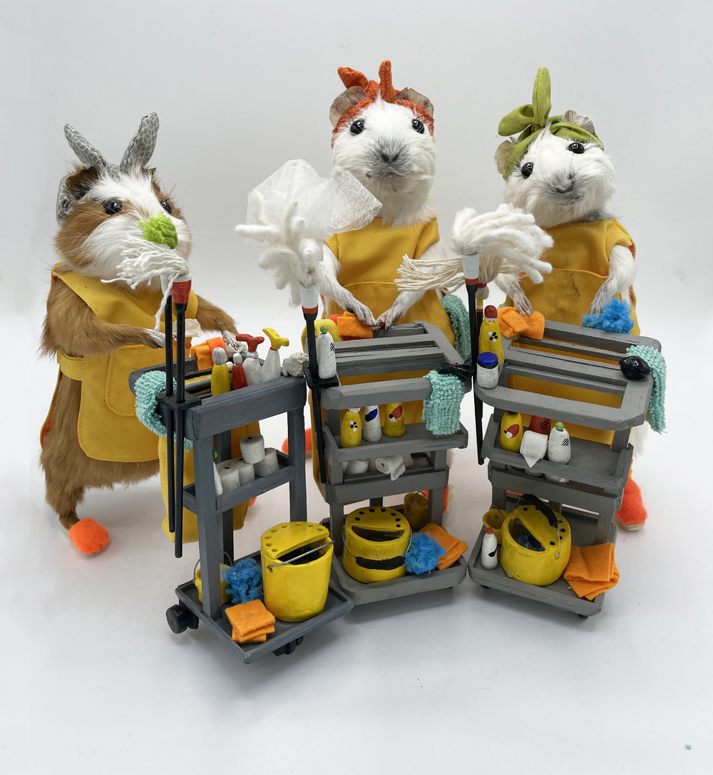 In the guise of Taxidermyjane, Jane Webster welcomes you to her first exhibition of anthropomorphic animals. Jane is an illustrator, educator and researcher who engaged in the craft over lockdown. All animals are ethically sourced from the snake food chain and have been given a new identity through character, costume and observation. Every aspect and detail is handcrafted and created as a unique piece. The ‘We’re all stuffed’ show explores relationships, roles and identity. A crew are putting on the event. Builders, craftspeople, make-up artists, dressers, technicians and caterers support the exhibits.