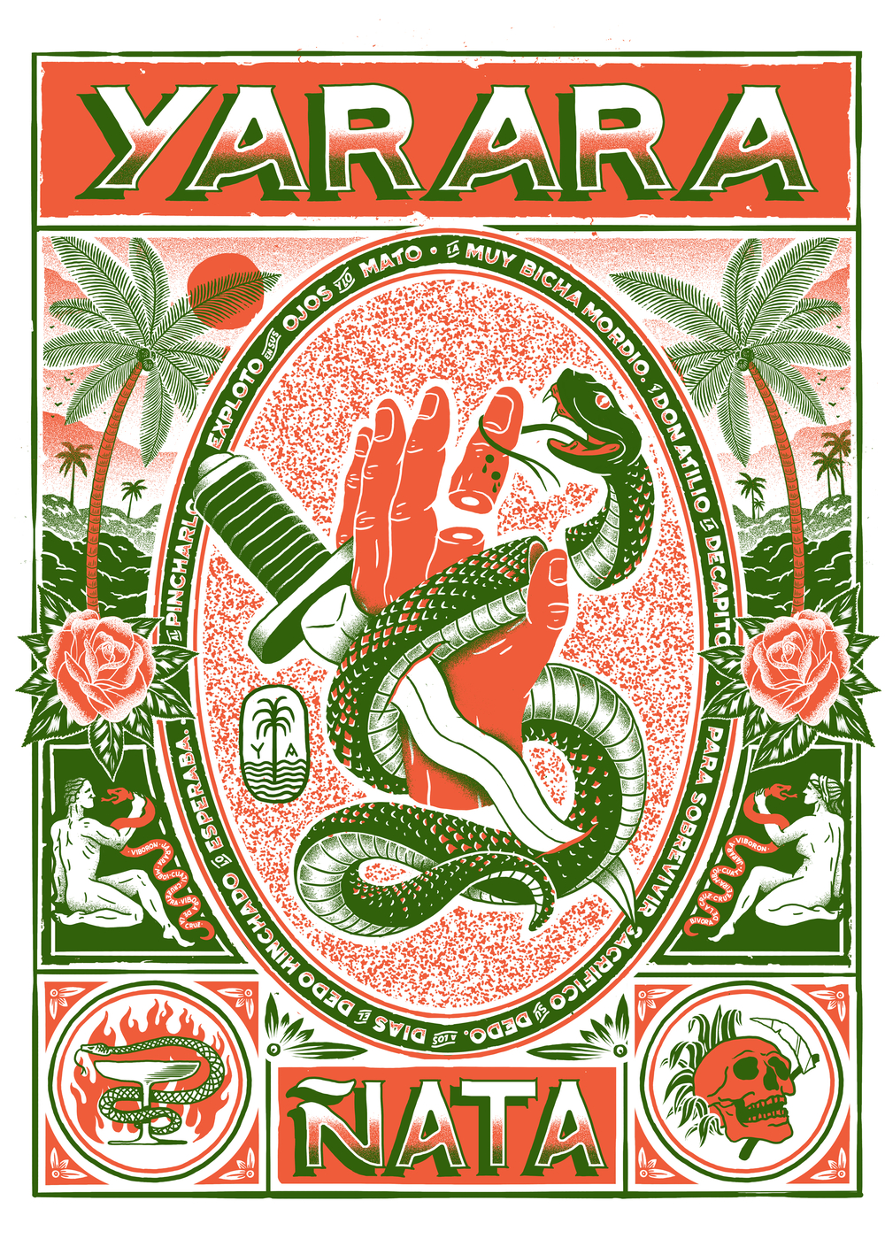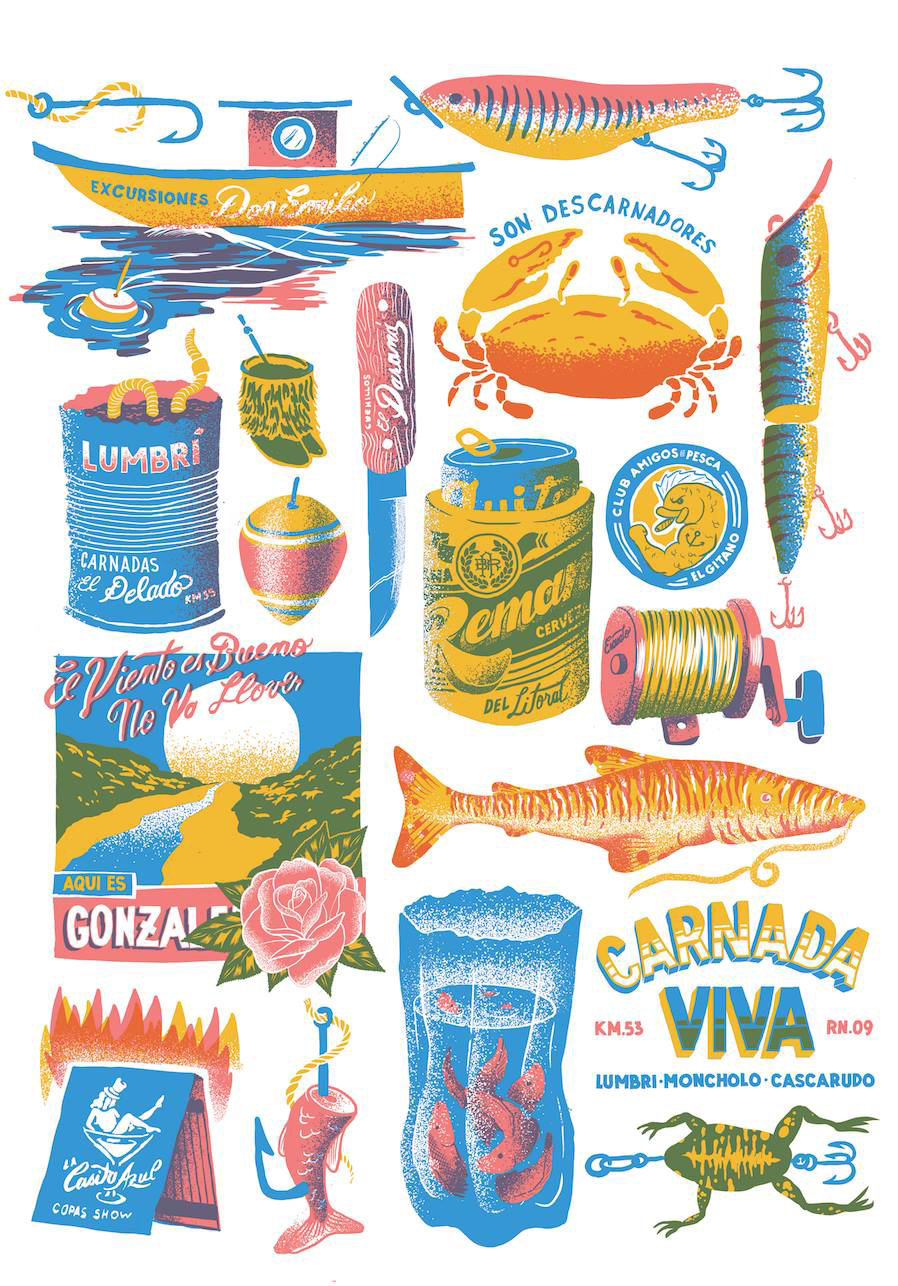 In Spanish, Carnada Viva means ‘live bait’. Ever since I was a boy I have been drawn to fishing, and to this day remain fascinated by the variety of the sport. Equally, I love the paraphernalia associated with it; the bait shops and their billboards. My friends and I most often fish along the huge river that runs all the way through the east of Argentina from the north to the south: The Paraná River. I’m completely amazed by this body of water. It flows through a dense subtropical forest and on its shores are colonial towns, sites of cultural heritage and the locale for some of the more significant moments of Argentine history. Within the water’s depths dwell the river’s inhabitants - mythical creatures. The meeting of these two aspects, the river and the towns, combines ancient nature with introduced European Christian ways of living. It is an area rich in the push and pull of cultivated and natural history and its subsequent development. Carnada Viva is a graphic essay in which I present all the elements that fascinate me about the culture found along the Paraná River.