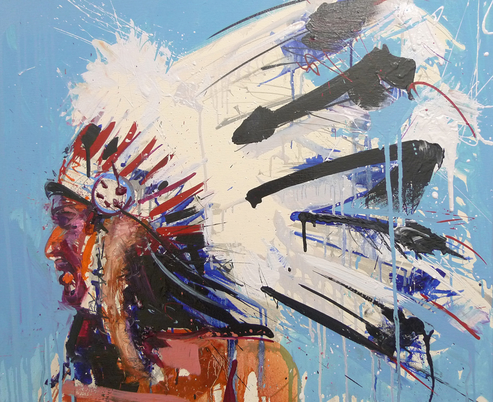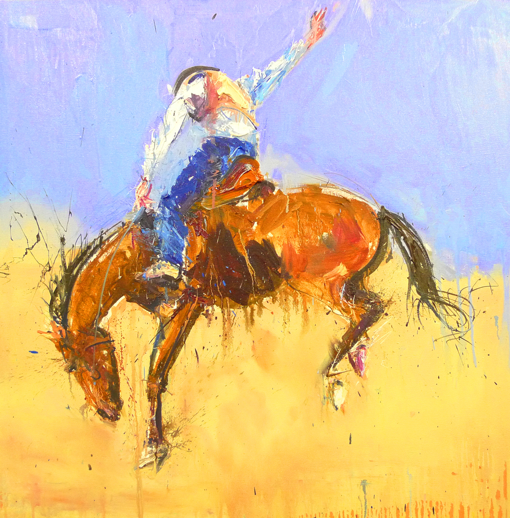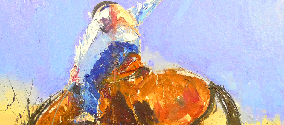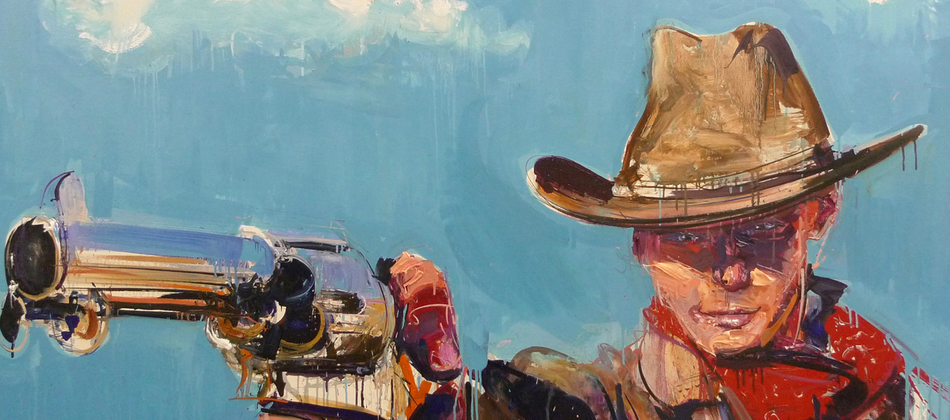 The golden age of the Western movie era is encapsulated in Dave Whites series of Technicolour oil paintings. High energy scenes, dramatic tension and sweeping Western backdrops could be said to be Whites innovative interpretation of the classic film still. The cultural inspiration of this period is evident in the apocalyptic themes of battles and stand offs. The turbulence and explosive movements are animated and presented through chaotic brushstrokes and the continuous energy of an artist dedicated to his own battle with the canvas.