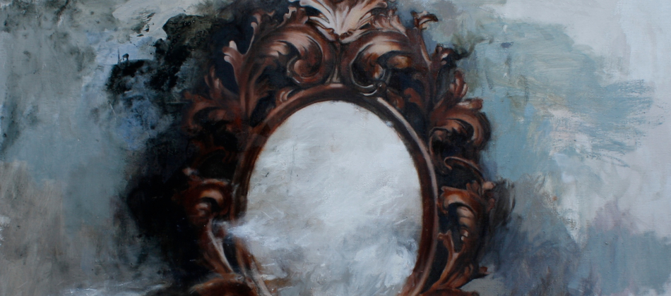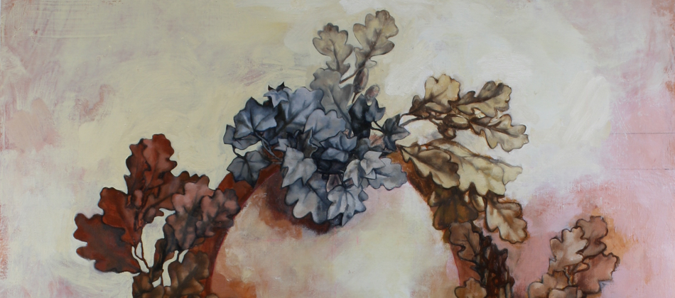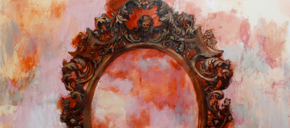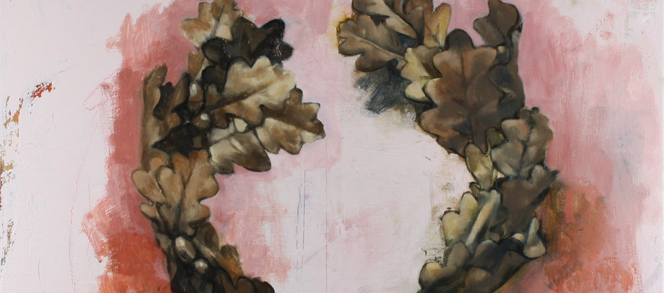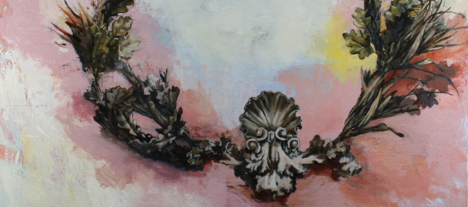 In this series of paintings, framing devices — wreaths, garlands and variegated assemblages of classical, baroque and rococo models — lead the viewer into deep vistas of allusive paint. Turbid workings, marks and gestures combine with films, skins and veils of sumptuous colour to make a seductive and dynamic surface, into which the figurative elements are integrated. Glazes, pools and accretions play across the picture plane, making reference to the mist, spray and vapour of landscape and atmosphere, suggestive of a space beyond.