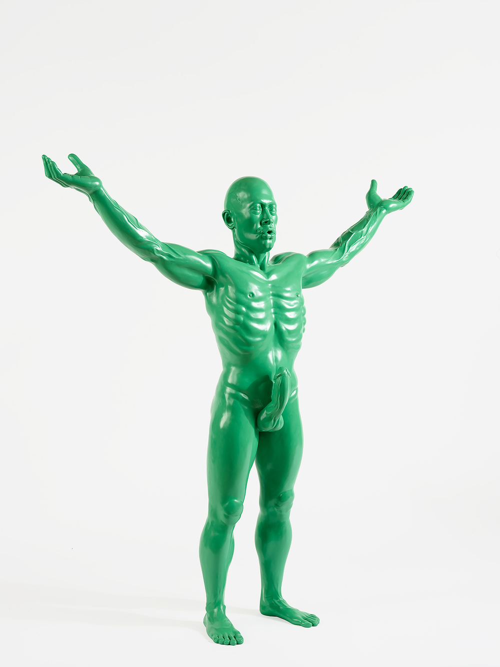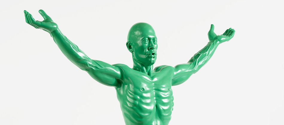 With this shift we are also invited to consider new emergent themes in Reid’s work: Claude Lége, Director of the Musée de Patrimone à Barthete de Boussan, remarks that there are parallels to be drawn between Reid’s new sculptures and ‘the resin casts of Marvel superheroes, or plastic children’s toys…The resulting body of work is healthy and robust where humour is present, but does not exclude thought or transcendence’. This attracts the question of how Reid’s day-to-day role as a parent – he became a father in 2012 – influences his work. Reid has often spoken about how his artistic practice and daily life shape and inform each other. It is not hard therefore to see how the significance of being a caregiver and the accompanying paraphernalia of a child’s world may well have had an impact, not only on a deeply personal level but also on his methodology and resulting work.
