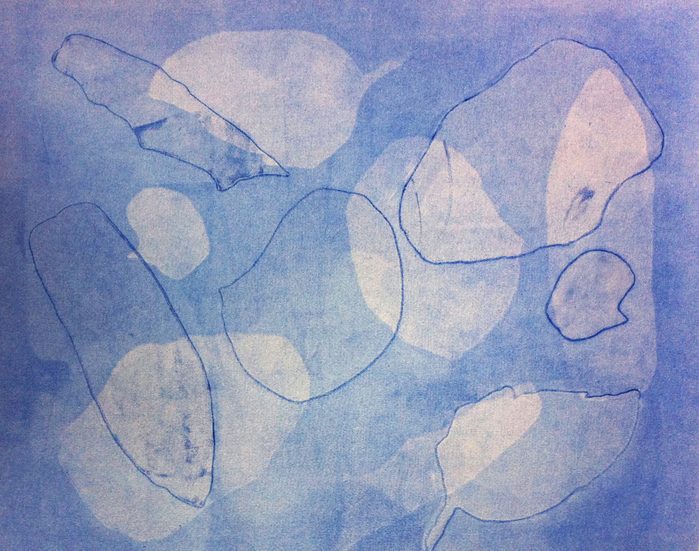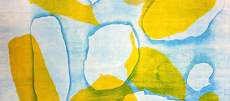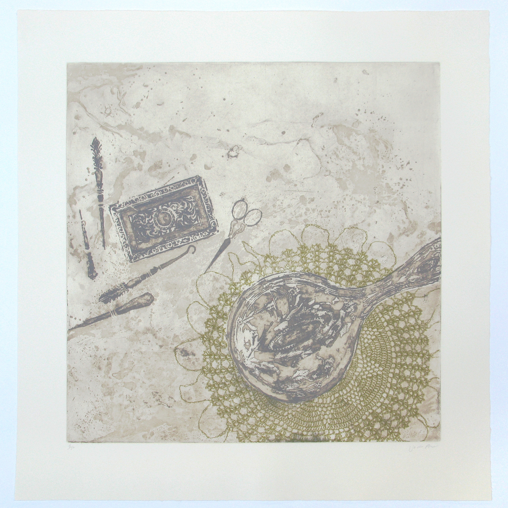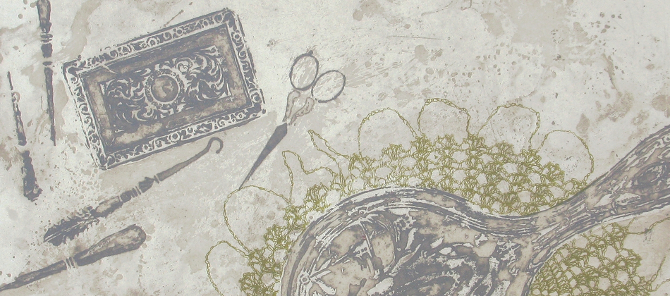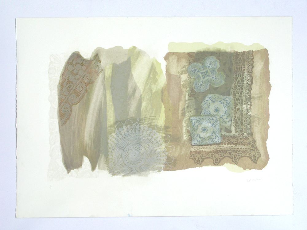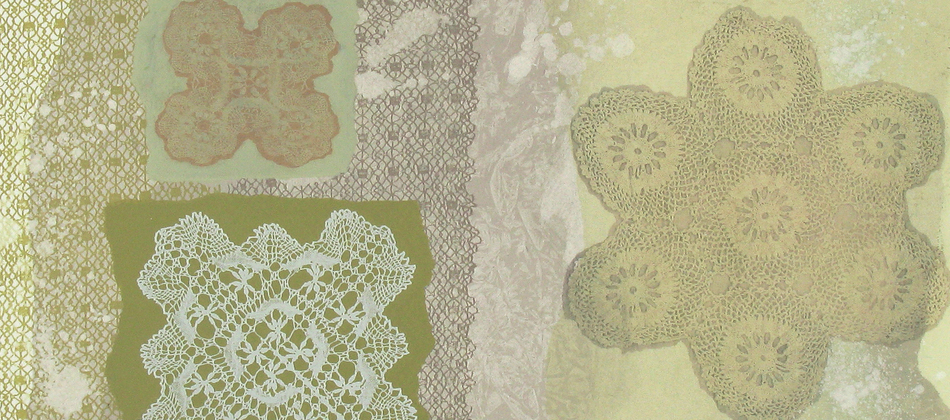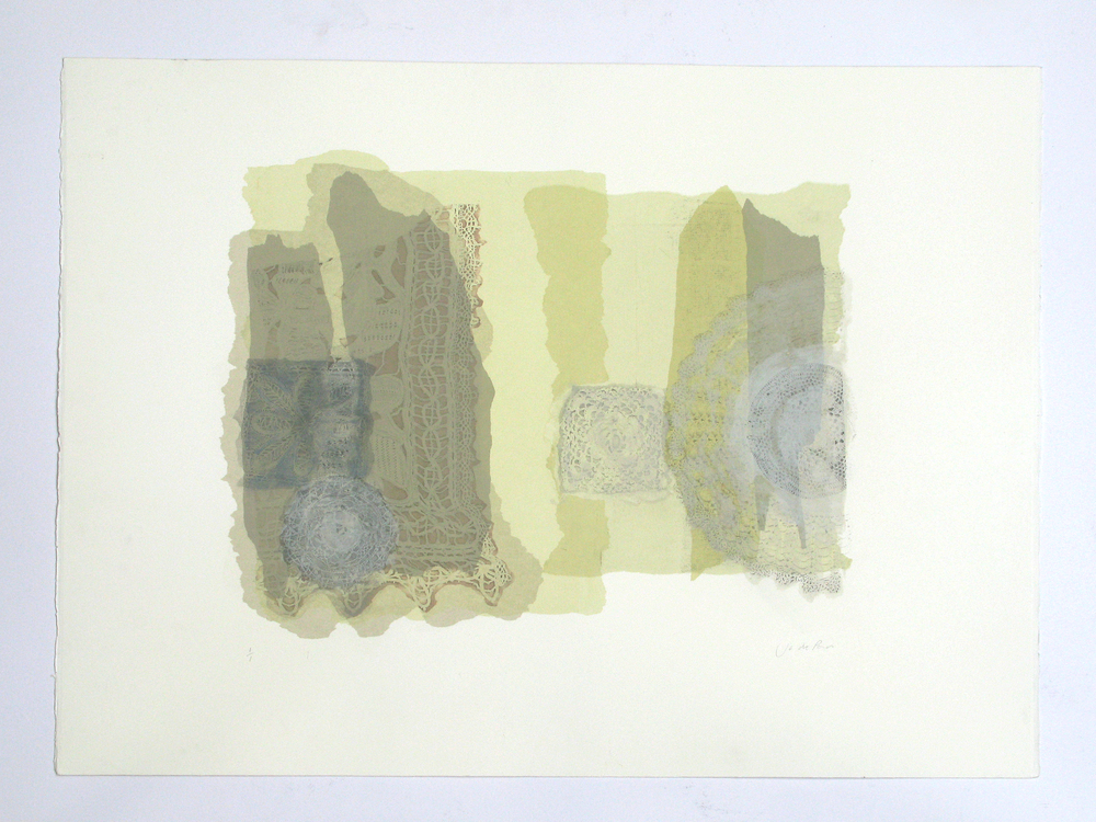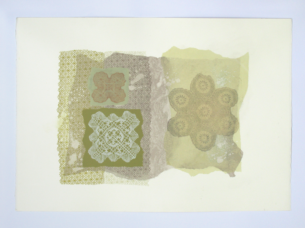 Jo’s work examines the notions of memory and loss. Through the collected detritus of inheritance, her prints are evokative of a bygone era. A topographical homage to hoarding. Her images evolve through a combination of monoprinting, silkscreen, etching and drawing. With subtle layering of the impressions left by old lace and doilies, often obscured through ethereal veils of colour, she builds her imaginary landscapes.