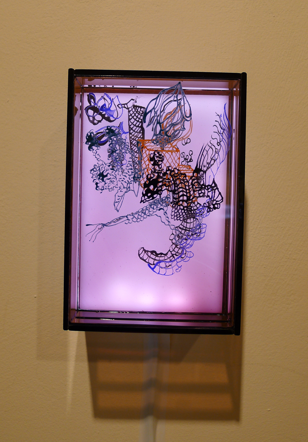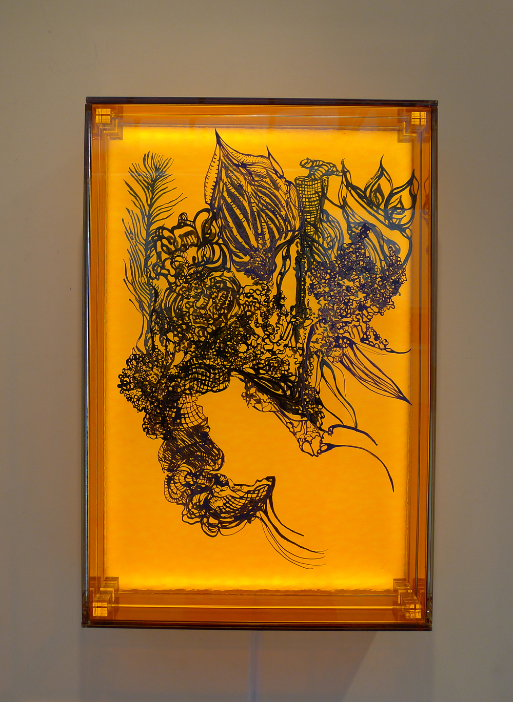Each artwork conceals a light panel which radiates hues of amber, orange, pinks and red through the coloured glass, creating a contemporary yet reflective ambience.