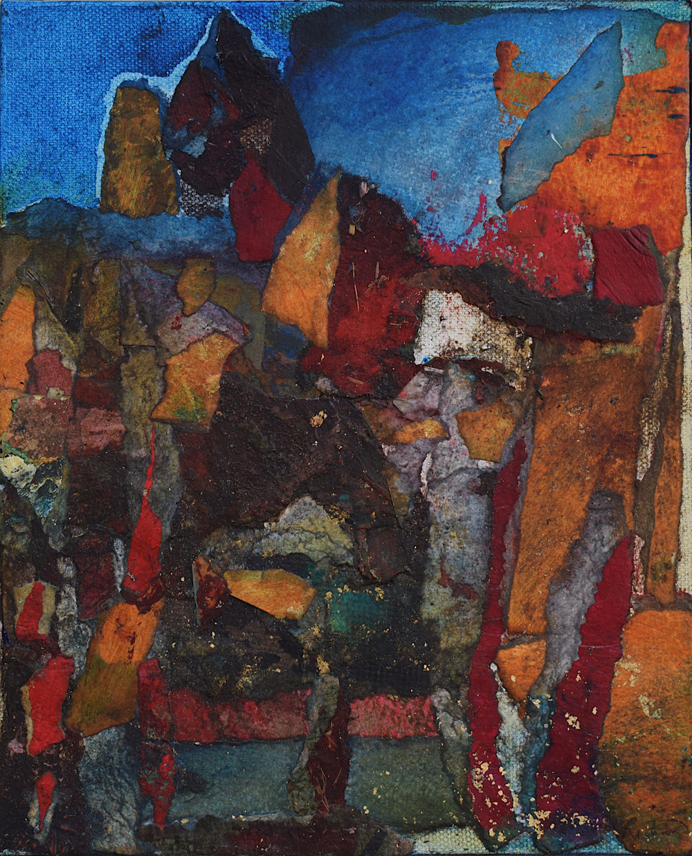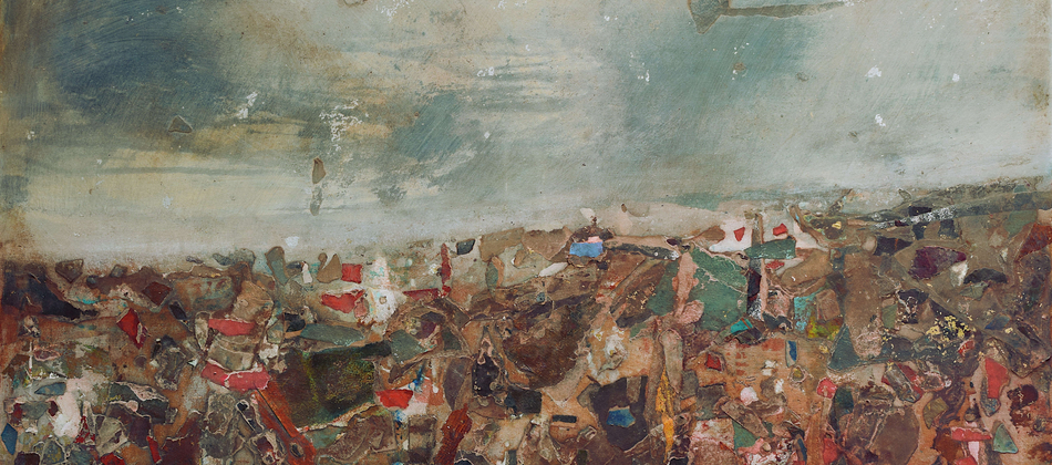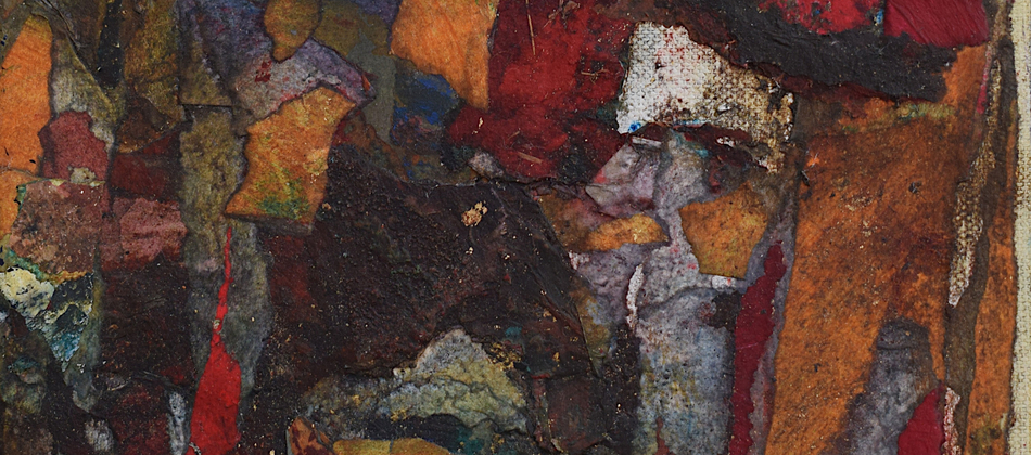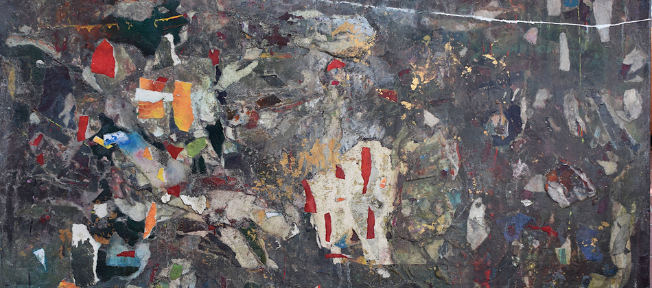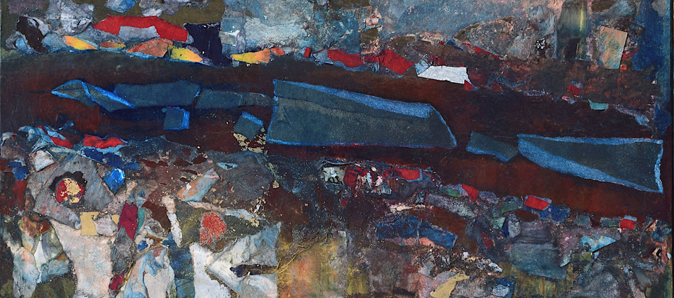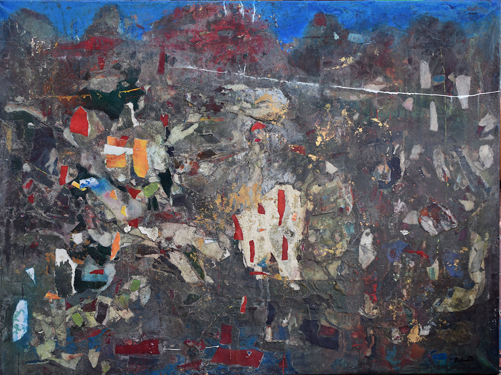The pandemic changed my work as well as my life. I don’t know why this surprises me. Partly out of expedience, partly out of a need to challenge myself, I decided to rely on what materials I had to hand in my studio. I determined to take unfinished paintings on paper that had accumulated over the years in my plan chest and use them as a source. Like making a mosaic, this new technique involved reassembling the earlier material, adding newly painted elements – this became the most important process – and forging something entirely different and surprising by adding washes and detail with brushes, rollers, rags and mops.