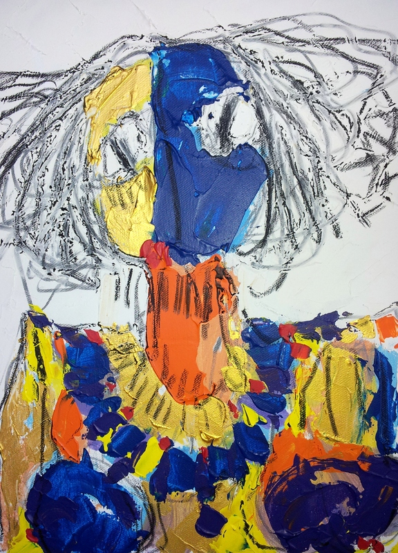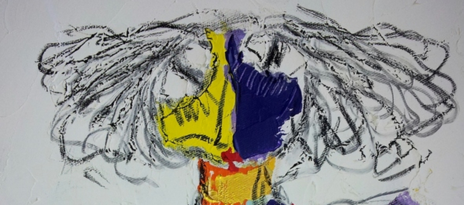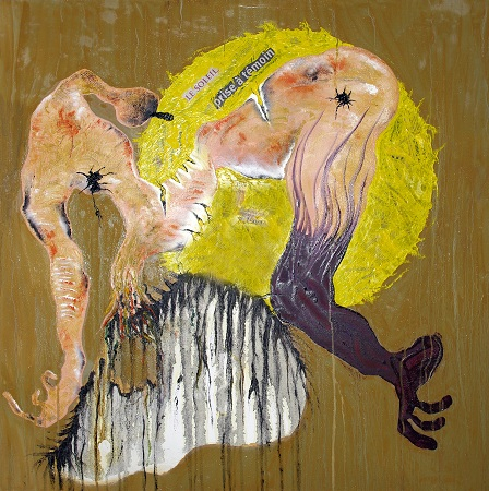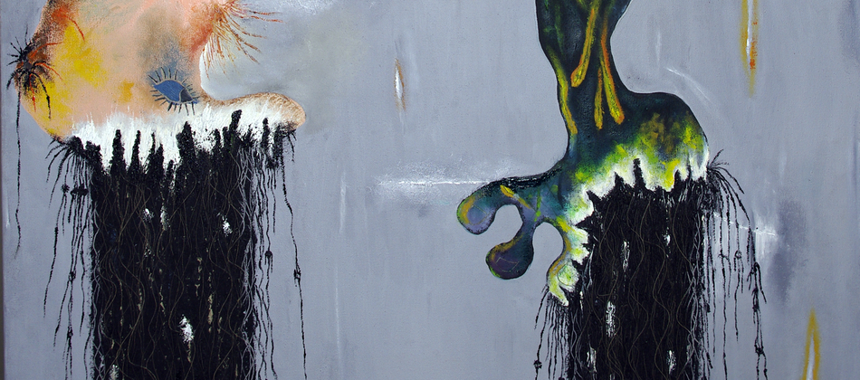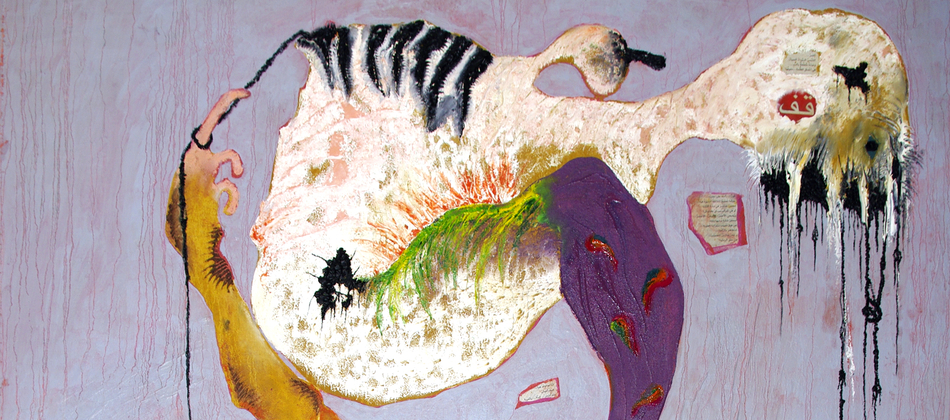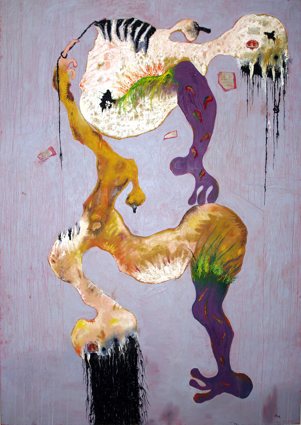 Salah Benjkan Benjkan associates his imagery with the Moroccan youth and the uncertainty surrounding their cultural and political identity. His childlike, somewhat comical creatures are distinctive features in his paintings. These fabulous beings are painted in bright coloured blotches and invade the white textured canvases. At first glance his playful depictions seem joyous and light hearted; at further exploration one notices a sense of melancholy. The figures are removed from reality, waiting for their destiny.