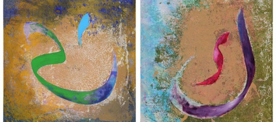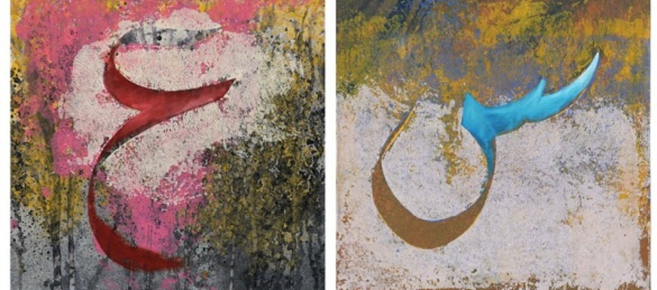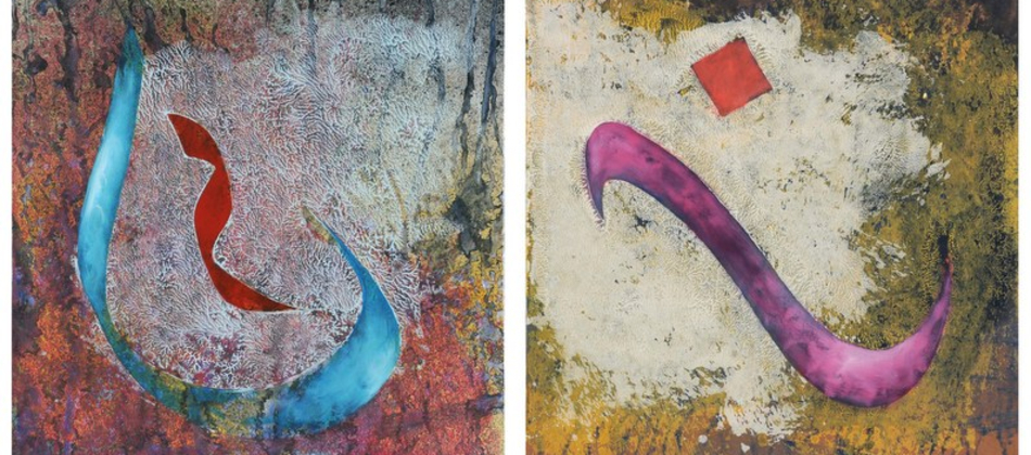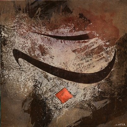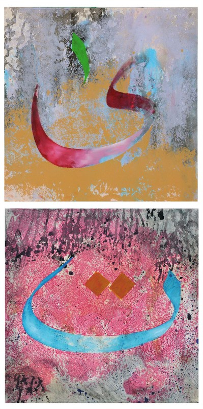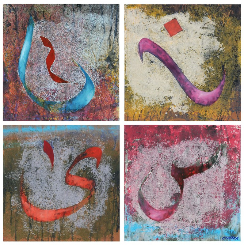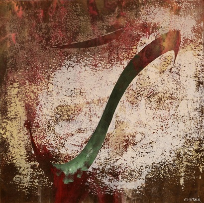 Nourredine Chater Chater states that his dynamic letters are the result of his ongoing studies which are influenced by a rapidly changing Moroccan society. His paintings are devoted to calligraphy and filled with gracefully encoded messages. From a distance the letters appear like secret signs. His playfulness with the graph is emphasised by his selection of colours. He is fond of natural hues and chooses vibrant shades for a more contemporary twist. The glyph predominates and symbolises both a point of entry and departure, and is a portal for an exploration of the sublime.
