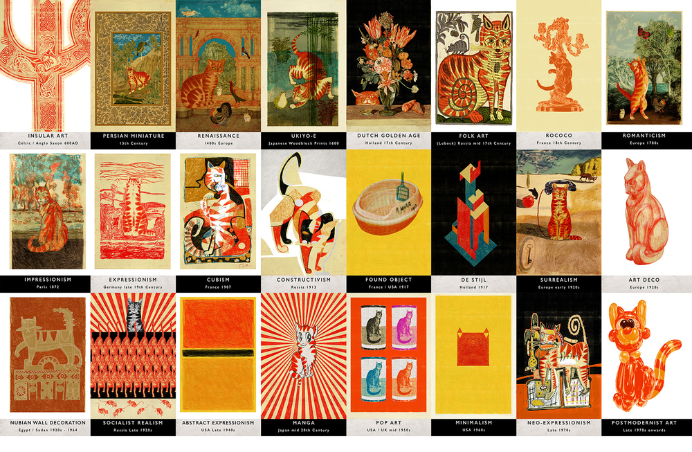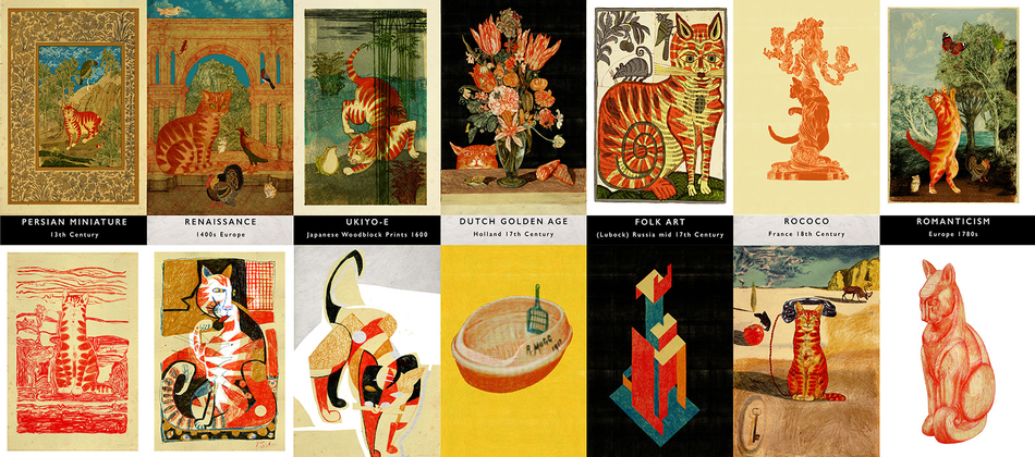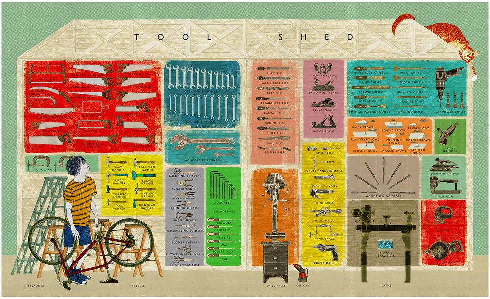 Three large-format archival limited-edition prints from One of a Kind: Art genres, 24 different images, in different styles, each one a cat The Tool Shed, the main character, Arvo, looks for his bike puncture kit Vehicles: ships, planes, trucks, helicopters, cars