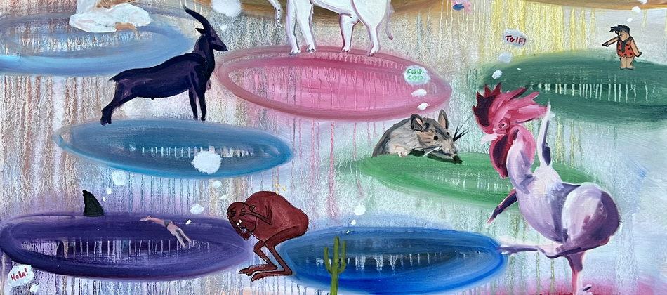 Each piece explores a different subject matter and within these contexts, the relationship between ego and creative genius feature prominently, the former represented by the goat, and the latter represented by the featherless rooster. Our ego references our past and serves to keep us safe, yet it can also prevent our growth and full potential (our genius), which knows no bounds.