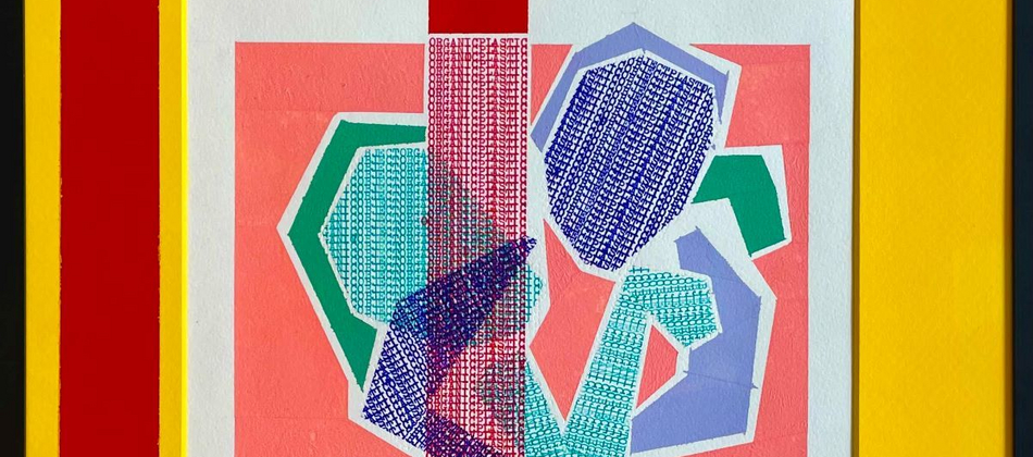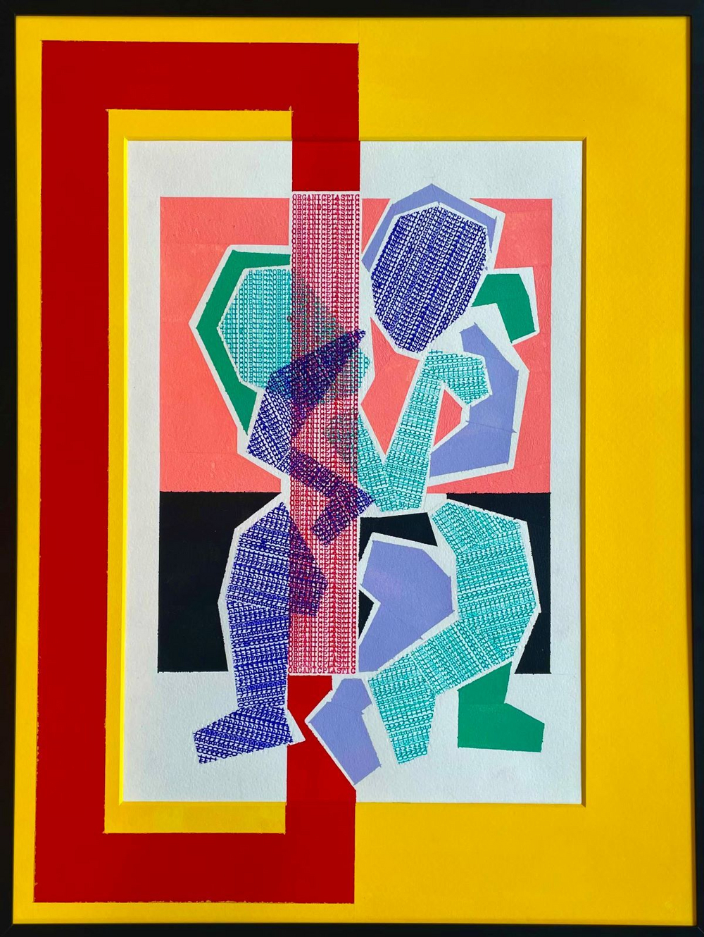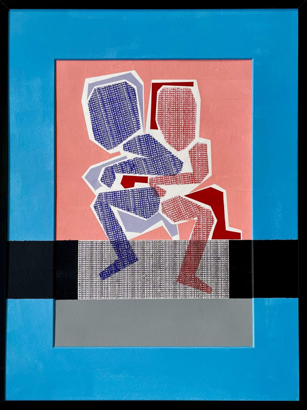 In the foreground of the triptych stand a group of entwined graphic figures caught in an ambiguous physical embrace. They are set against a backdrop of colour and words that appear to be commenting on the events before them. This juxtaposition expresses the uneasy relationship between participation and objectification inherent in the human condition.
