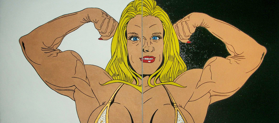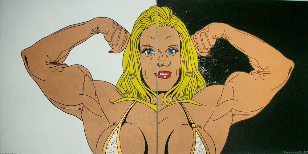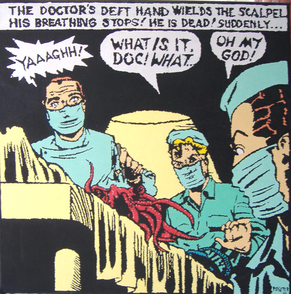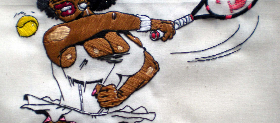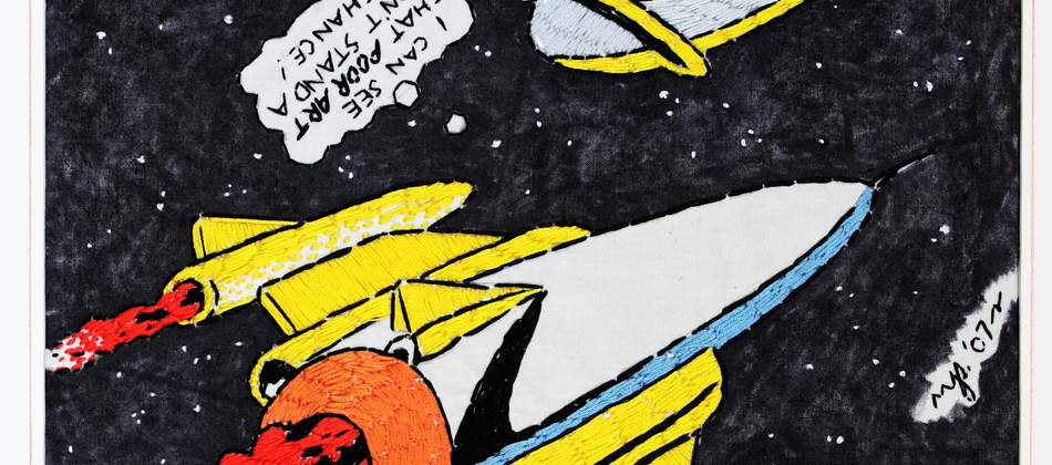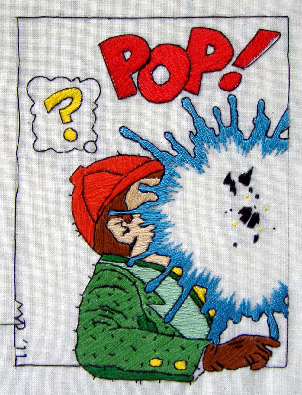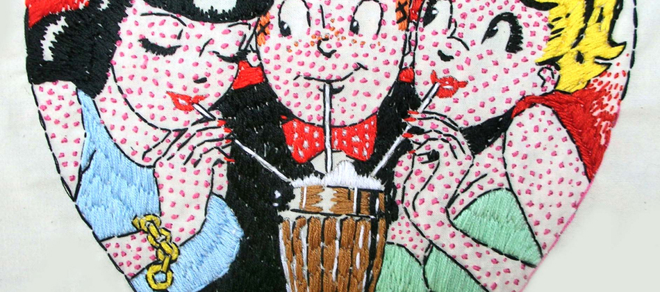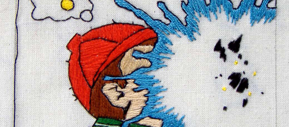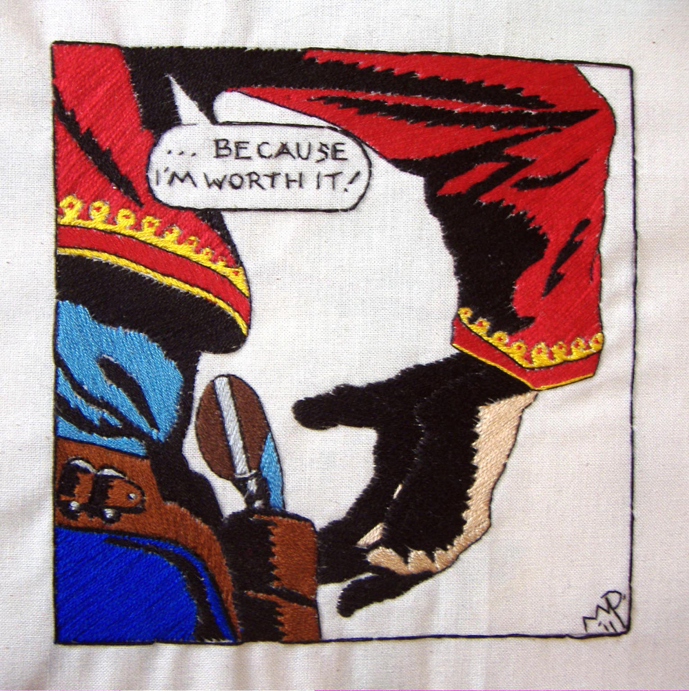 Malcolm Poynter’s pop art style employs the use of comics, cowboys, pin-ups, toys and cheap advertising to freshen up and elevate needlework for a more contemporary art market. His dual passion for Van Gogh artworks and Eagle magazine could attribute to his present style, which combines nude women and comic books.