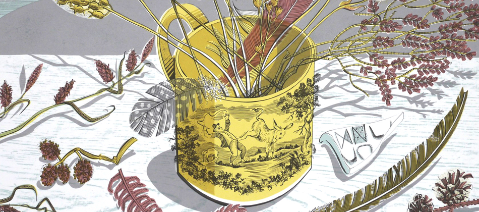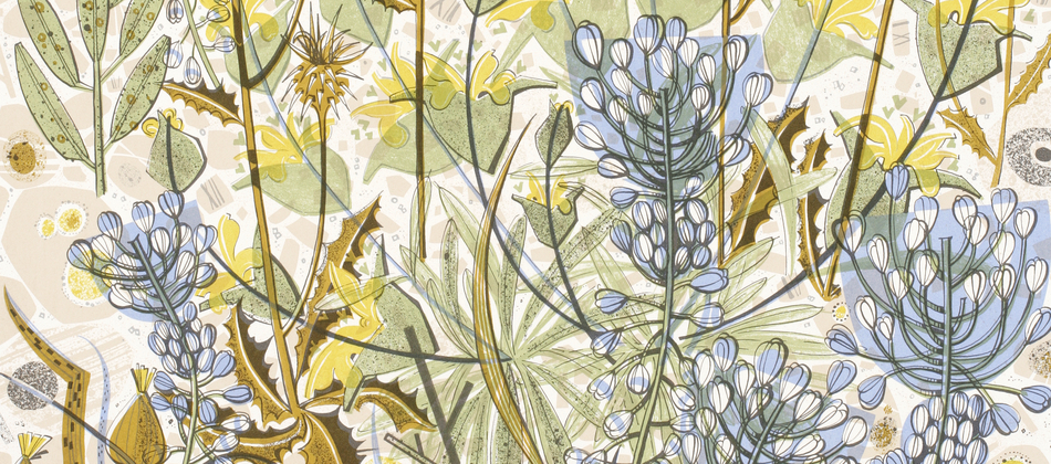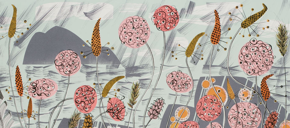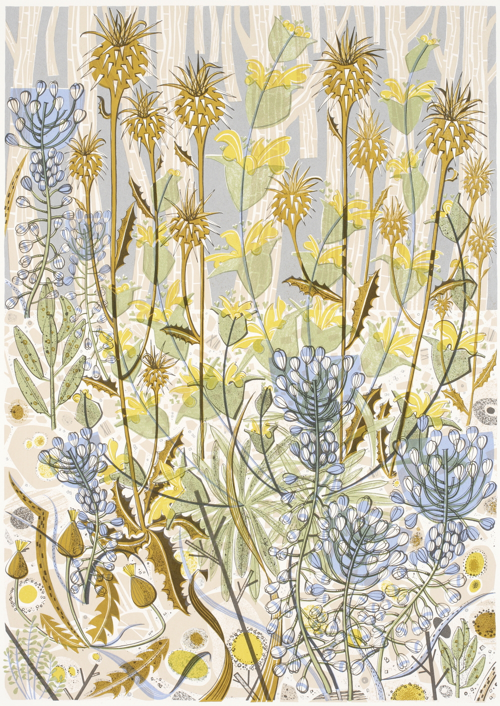 Angie Lewin studied BA (Hons) Fine Art Printmaking at Central St. Martins College of Art and Design, followed by a year’s postgraduate printmaking at Camberwell School of Arts and Crafts. Angie creates limited edition linocut, wood engraving, lithograph and screen prints – inspired by skeletal plantforms seen against the sea and sky of North Norfolk and the Scottish Highlands. She is a member of the Royal Society of Painter-Print makers and of The Society of Wood Engravers. In addition to her limited edition printmaking and fabric design for St. Jude’s, Angie has also designed fabric for Liberty and has illustrated for Penguin, Conran Octopus,Virago and Faber & Faber. In 2010 Merrell published ‘Angie Lewin: Plants and Places’ which profiles Angie’s work over 192 pages with 240 illustrations.