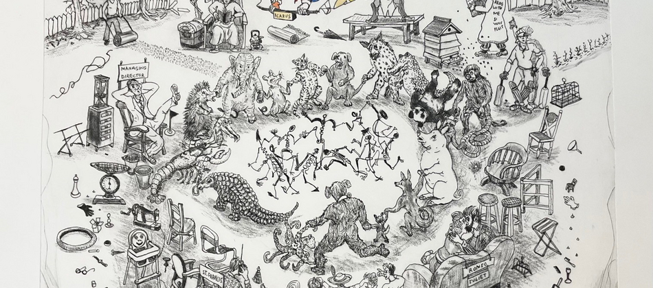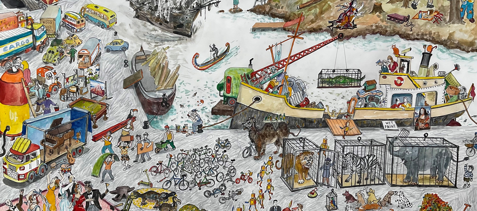 My new painting, ‘Cargo’, a successor to the earlier ‘Ship’ painting, deals with the many sided idea of what we carry and send around the world. On the quayside cages of wild animals, mountains of fruit, dancing couples, a collection of cricket bats, bicycles, grandfather clocks and robots prepare to be shipped. Entering the harbour is the ‘Black Freighter’ a ghost ship. De-forestation is going on in the top right side of the painting. This is about the consequences of exploitation.
