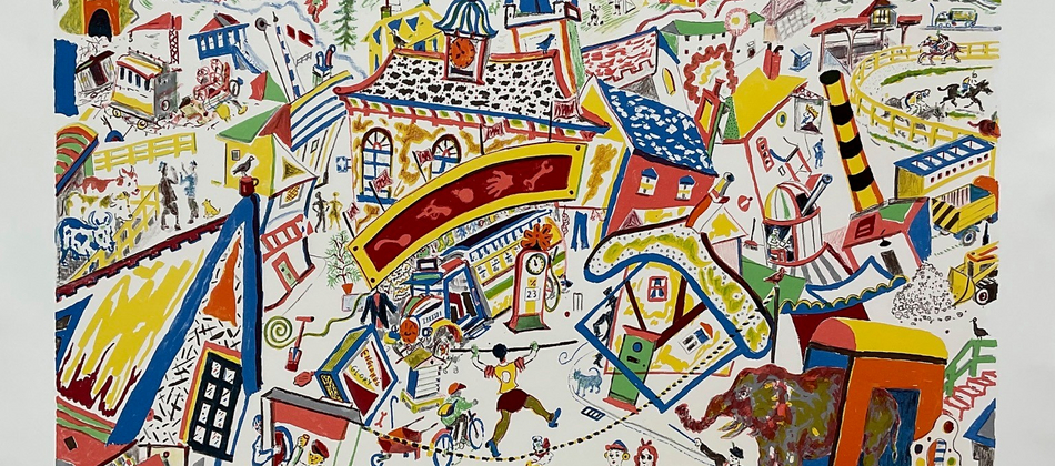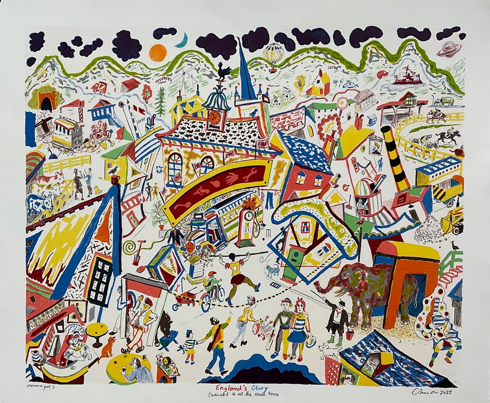 Every year I make work about places that I have visited and this show will include my ‘Red roofs of Shimoda’ from my trip to Japan in 2022, where I painted a group of new houses with bright red roofs in the small town of Shimoda a couple of hours away from Tokyo. Also there will be my drawing ‘Uttar Pradesh landscape’ and my painting ‘Beirut 2022’. In these apparently straightforward works there is still an agenda of narrative consequences. Chris Orr, July 2023