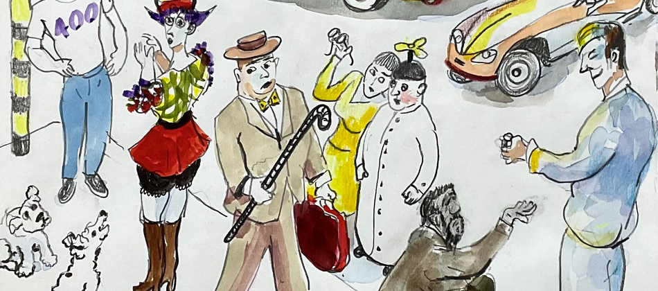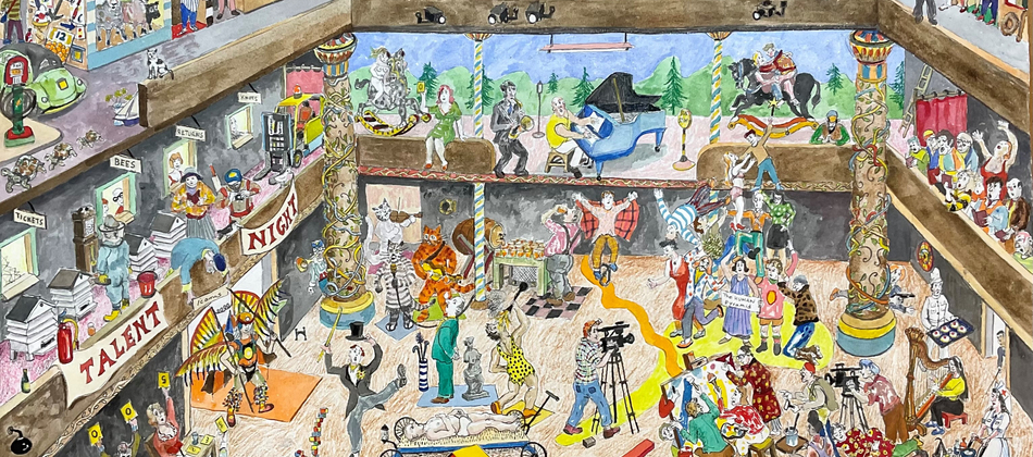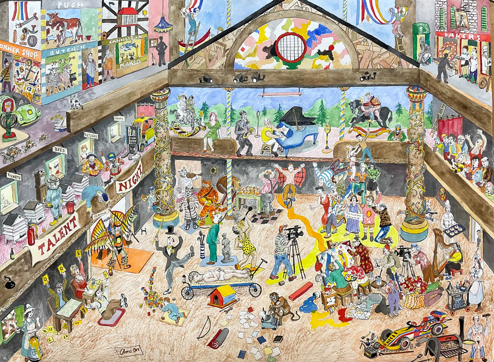 Another new painting is called ‘The Human Pyramid’. Icarus arrives at Talent Night and sees many weird and wonderful goings-on including the eponymous Human Pyramid. We are all dependent on each other, but at the same time alone. There are many ways to get to the sun.