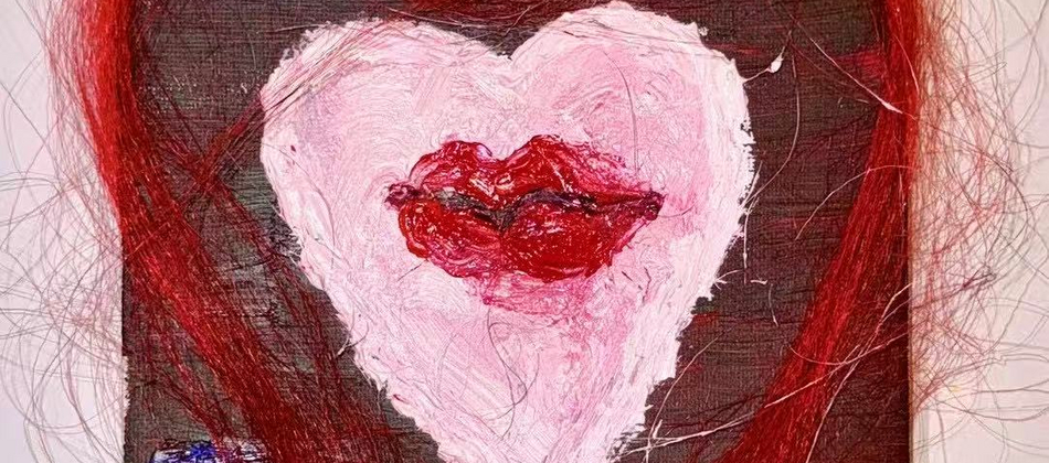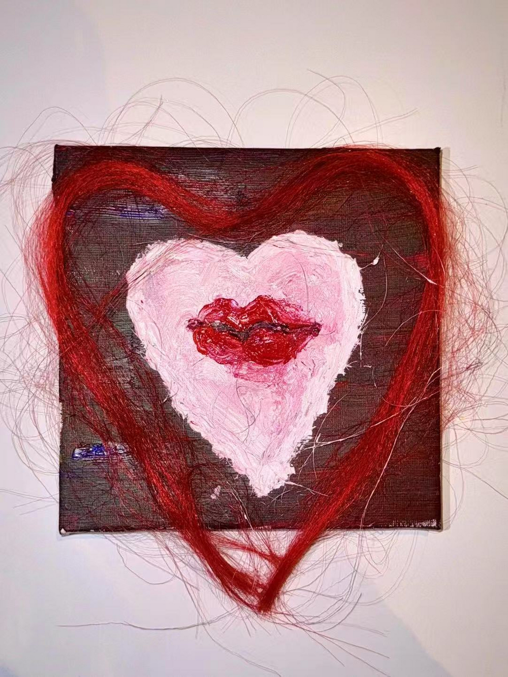 Intuition Rooted in desire and intimacy, this work explores the tension between tenderness and control within relationships. A lip imprint within a heart-shaped form becomes an intimate trace, marking the threshold between soul and flesh. Red threads flow like bloodlines, weaving passion and pain against the shimmering presence of gold leaf. This interplay of sacredness and sensuality reveals desire’s dual nature: transcendent yet primal, life-giving yet destructive. Through painting, collage, and material experimentation, the piece transforms longing into a tactile memory of the body, inviting viewers to feel the breath and burn of intimacy.