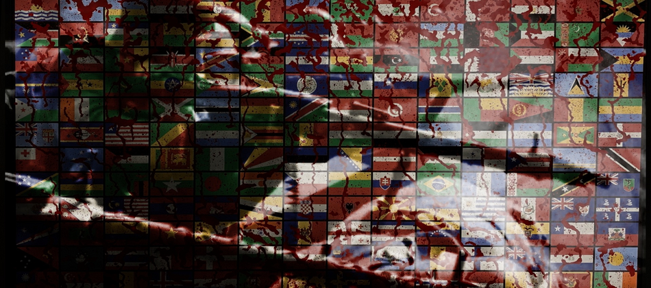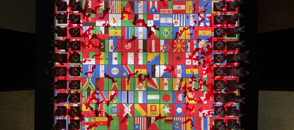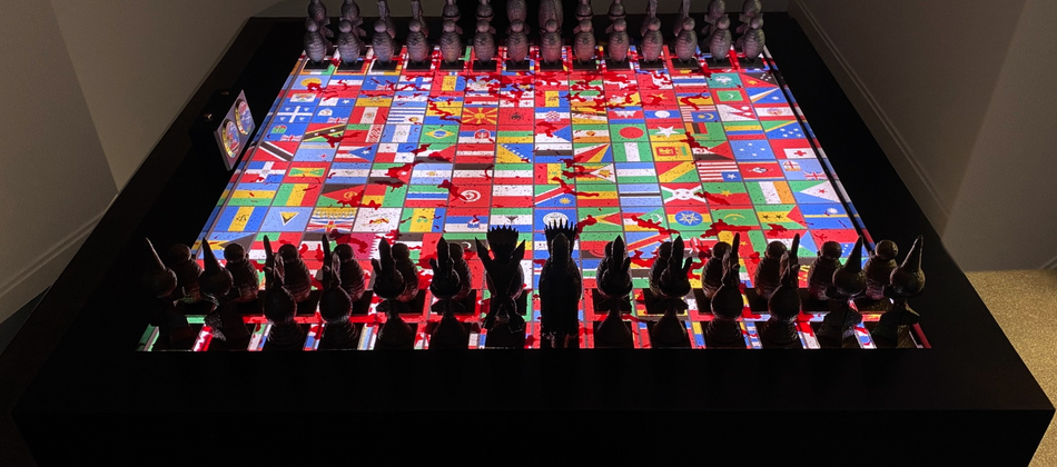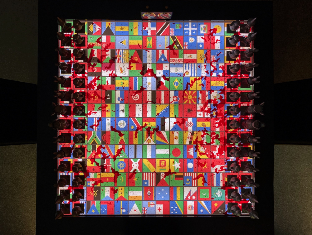 This series of work titled UNITY, conveys a message of putting a stop to unnecessary wars at the expense of innocent human civilians, who are like pawns on a chess board. Cahn has created two installations of light boxes; one being a large chessboard with 196 flags, representing the 196 countries of the world. The chess board comprises of 196 squares and is on a grid of 14 x 14 with 28 pieces, instead of the standard chess board that comprises of 64 squares of 8 x 8 grid and 16 pieces. As chess is a very strategic game with two opposing players, the arrangement of the 196 flags were also strategically positioned on the board.