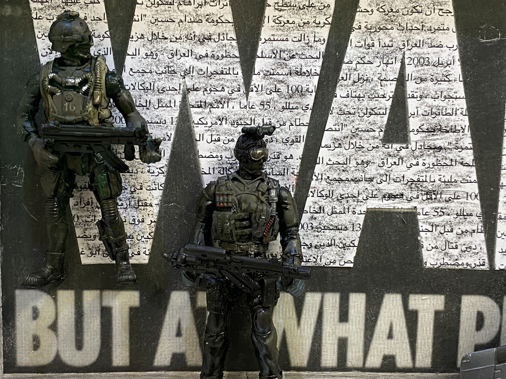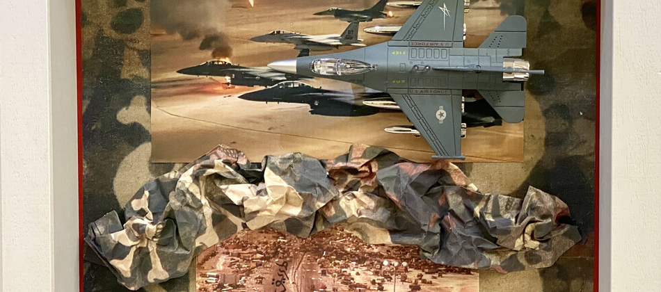 The other light box has a black and white film projected over the 196 saturated coloured flags. The film is a compilation of war footage, dating back to WWI and features a soundscape blending together the sounds of warfare. The senses are enlivened through sound and space to immerse the viewer in the obscure vision of warfare. In addition, Cahn has created some paintings representing silhouettes of tanks, fighter planes and AK 47s. She has also created some assemblages, whereby three dimensional collages are created with found objects to a two dimensional surface.