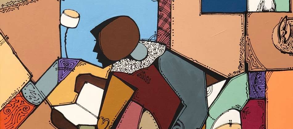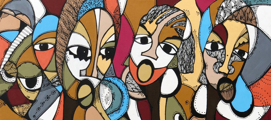 We Find What We Seek, the title of the exhibition, presupposes that no matter which geographical, philosophical, or spiritual planes we transverse, the bonds we create are not formed by proximity but rather commonality. Ben Agbee’s colourful contortions are an ode to the characters which make up our communities; with women, children, and animals as pillars of strength and sustenance. His use of intense colours, applied with delicate precision, coupled with his signature use of symbolism, form complex yet coherent compositions of cultural nuance. This translation of culture onto canvas is recognisable within James Mishio’s portraiture and figurative paintings which capture the “mood of the moment.” His ability to communicate the multitude of human temperaments with a revelatory realism, subjects the viewer to a place of quiet introspection, where the personality of the sitter transmits itself through the richly textured impasto. Theophilus Tetteh’s work combines the dramatic and intimate into transient tales of city life. His figures, which at times stand solo and at other times are accompanied by large crowds, offer an enchanting spontaneity where the subject appears to be captured within the bustling environment and time is momentarily paused. The architectural framework Tetteh employs brings his characters front and centre, as though to accurately make known their particularity; of that which is obvious and hidden. Jimas Ametonou’s meditative compositions abstract the subject from their locality and reposition them into a realm in which their reality is restructured through a universal lens. At once, these subjects participate not at the effect of their environment, but as the source of its creation. As the curator of the show Kensu Oteng suggests,