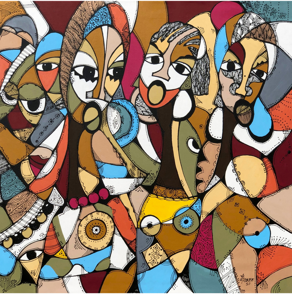 About Theophilus Tetteh Theophilus Tetteh (b.1991) lives and works in Accra, Ghana. He studied Graphic Design and Painting at Marimus Art School, whilst continuing to experiment with different media. Tetteh’s practice synthesises the mechanics of the man-made environment with the natural order of the world. His figures which appear static and singular, are in fact dynamic entities of the local culture. Tetteh has participated in solo shows and group projects across Ghana, notably the Kente Design Project for Kejetia Market (Kumasi, 2017) and National Theatre of Ghana (Accra, 2018).