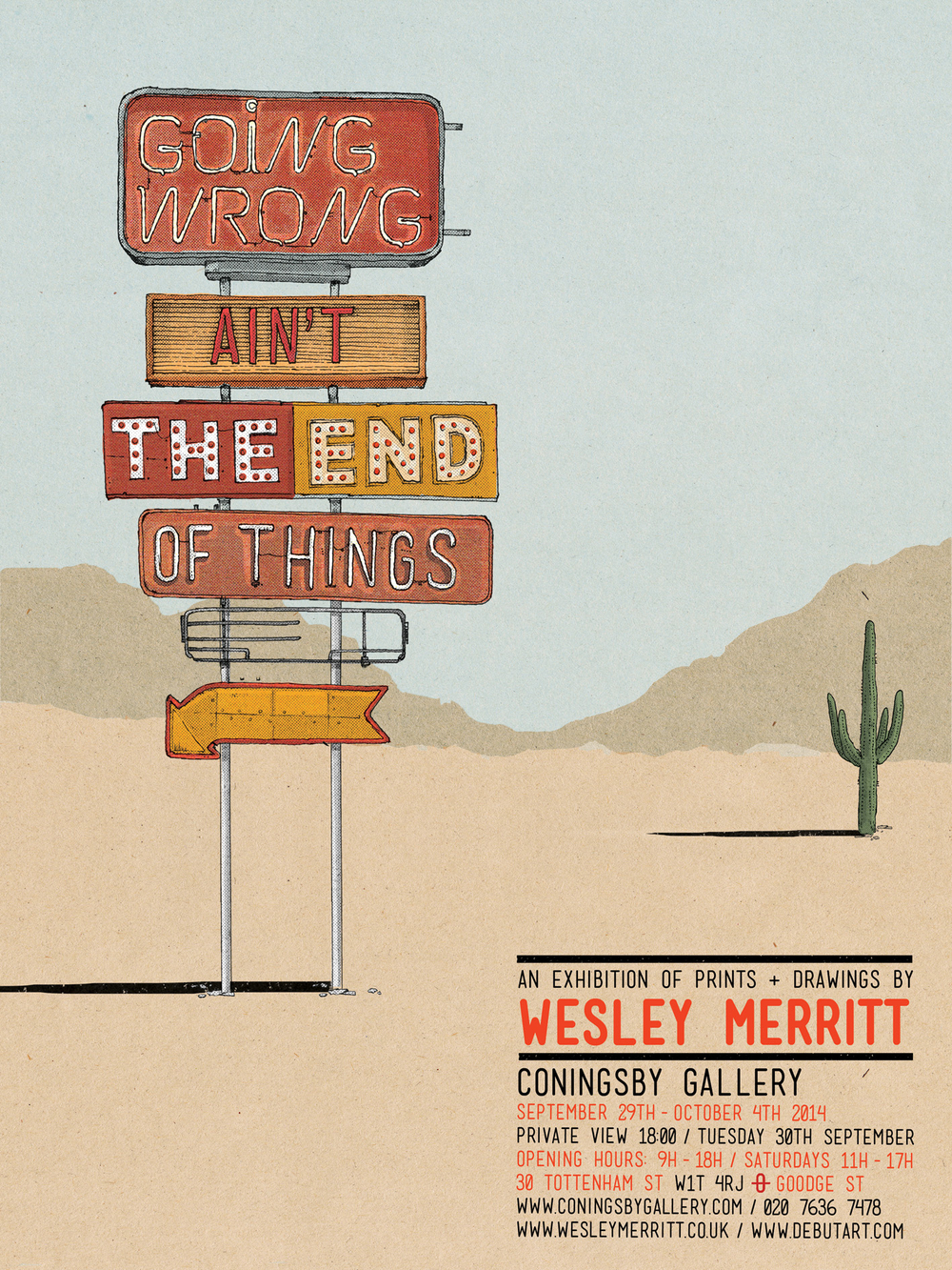 Going Wrong Ain’t The End Of Things is the culmination and exhibition of Wesley’s recent work. A selection of images from Wesley’s regular Saturday Telegraph Review’s book section will be shown alongside unpublished illustrations and drawings for Joseph Conrad’s Heart Of Darkness. Myriad sketchbooks and ink drawings will be on display, as well as a series of Polish-influenced-Dadaist-by-way-of-Wesley-Merritt film posters.