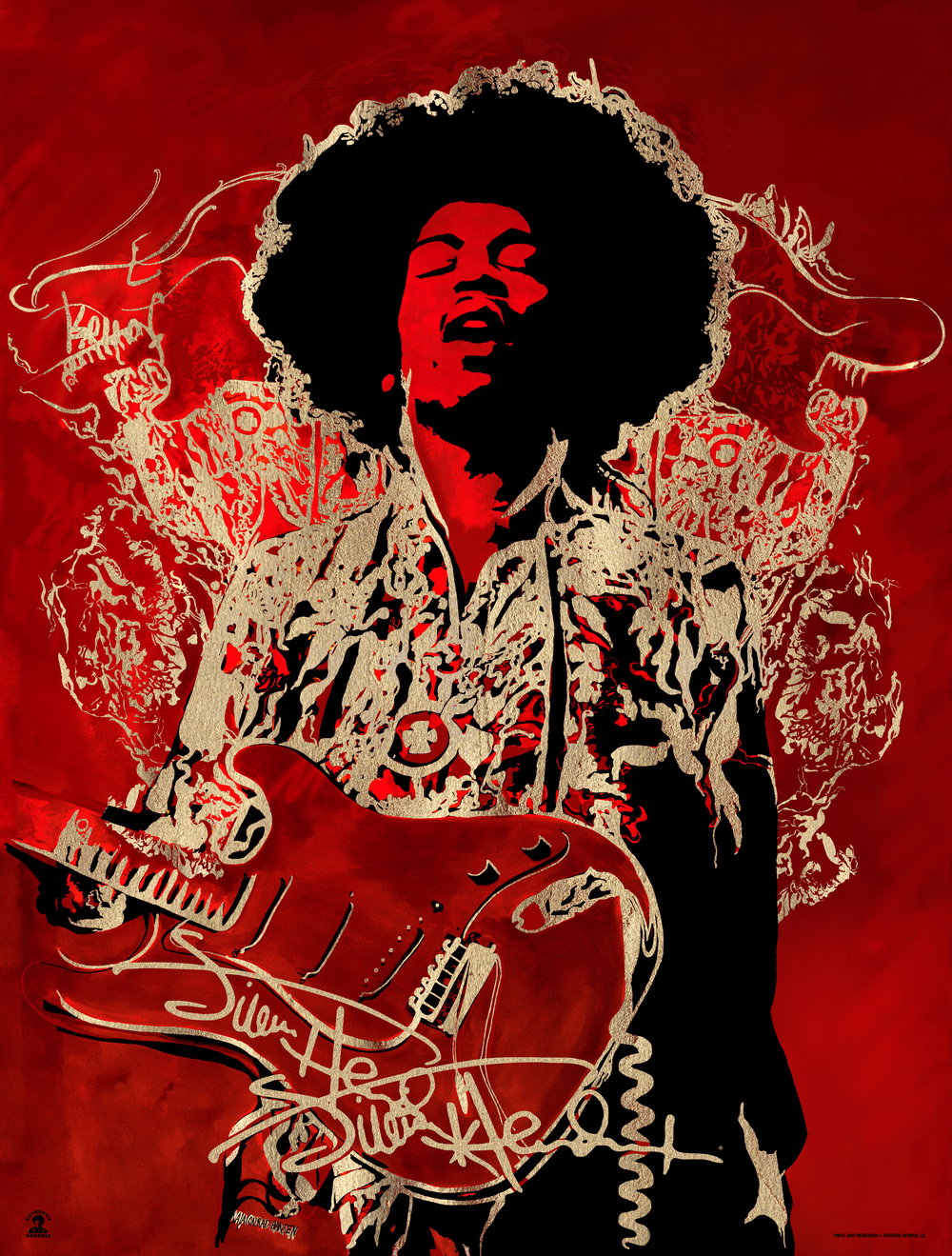 A silkscreen portrait illustration of Jimi Hendrix in an edition of 50