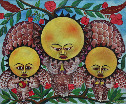 Roger François was born around 1928 in Petite Riviere, on the Artibonite plain of central Haiti. He began as a wood sculptor and still carves occasionally. He has been painting as well since the early sixties. He loves to paint and sculpt Haitian women, both nudes and market women with baskets and braids. Besides women, Roger François paints animals: cats, dogs, horses and owls, and in the early 1990’s, began painting sun and moon heads on human bodies. He also does an occasional surreal voodoo painting. His style is robust, bold and always fresh and new. He is a charming, explosively good natured man . A painting of his hangs in the National Museum, Brussels, Belgium and another was exhibited in the show of Geoffrey Holder’s collection, “Spirits” at the Katonah Museum of Art, (NY) in May 1991.His work has appeared in books and museum shows internationally. He is one of Haitian art’s best kept secrets.