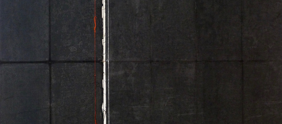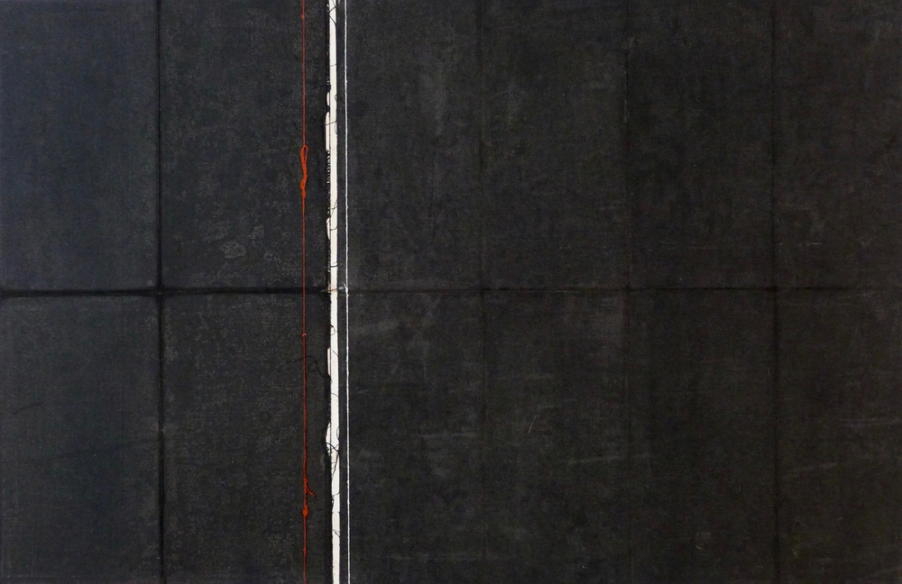 Acrylic on reversed linen-mounted maps with painted threads, 2014