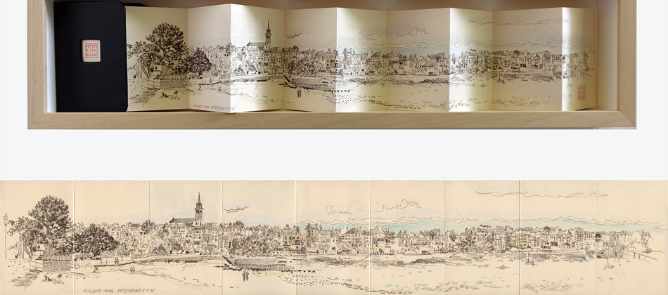 Sepia drawing with pigmented India ink, watercolor’s wax on cream color paper Vivaldi 240 g Leporello 9 leaves 5,51 X 31,88 inches In Bound Book 4,33 X 5,90 inches Framed with natural wood Ayous. 31,4 X 7,67 X 2,36 inches