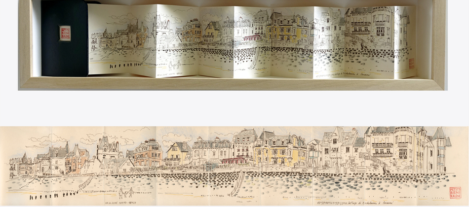 Sepia drawing with pigmented India ink, watercolor’s wax on cream color paper Vivaldi 240 g Leporello 9 leaves 5,51 X 31,88 inches In Bound Book 4,33 X 5,90 inches Framed with natural wood Ayous. 31,4 X 7,67 X 2,36 inches