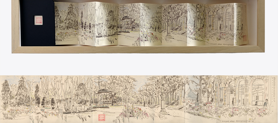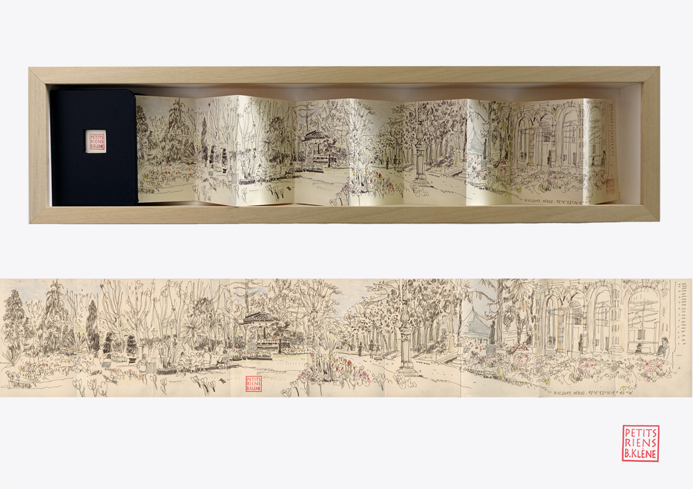 Sepia drawing with pigmented India ink, watercolor’s wax on cream color paper Vivaldi 240 g Leporello 9 leaves 5,51 X 31,88 inches In Bound Book 4,33 X 5,90 inches Framed with natural wood Ayous. 31,4 X 7,67 X 2,36 inches