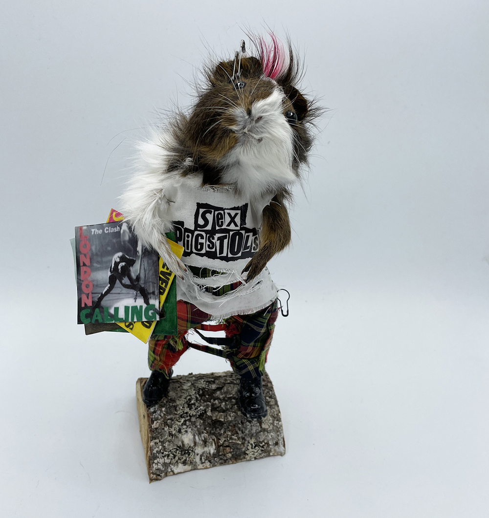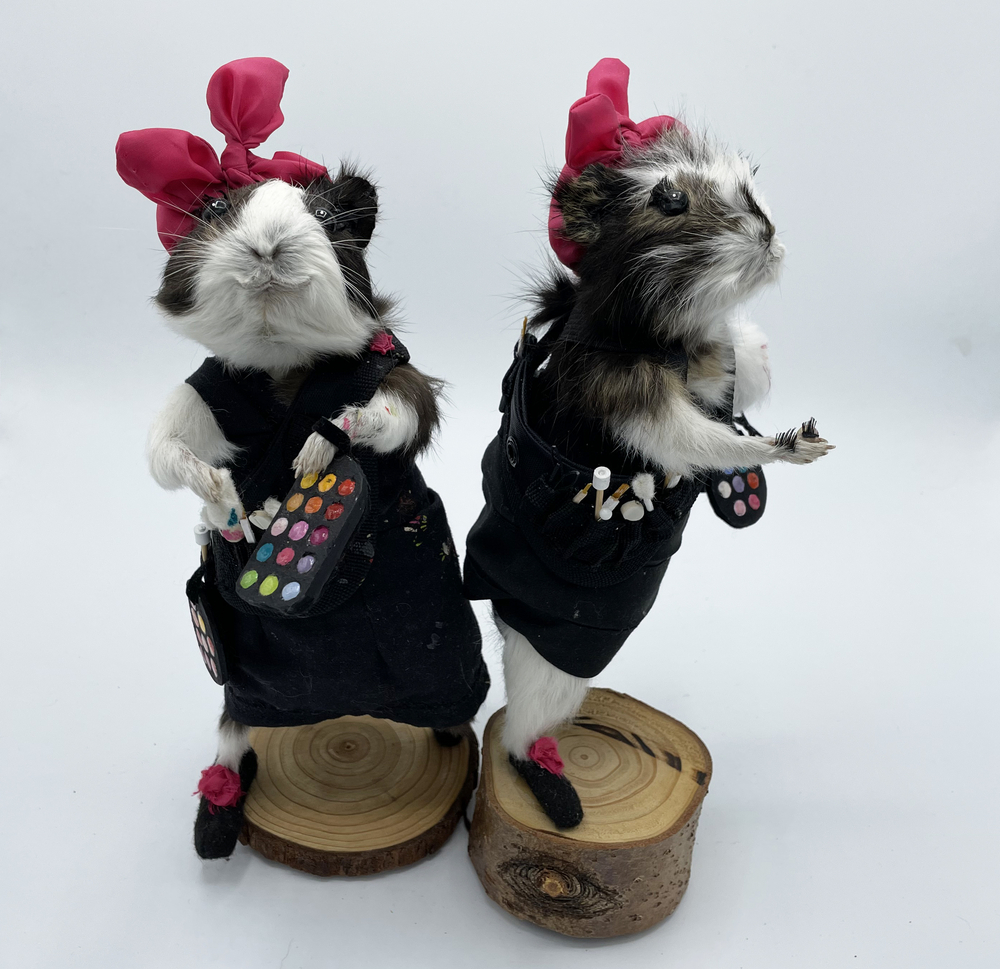In the guise of Taxidermyjane, Jane Webster welcomes you to her first exhibition of anthropomorphic animals. Jane is an illustrator, educator and researcher who engaged in the craft over lockdown. All animals are ethically sourced from the snake food chain and have been given a new identity through character, costume and observation. Every aspect and detail is handcrafted and created as a unique piece. The ‘We’re all stuffed’ show explores relationships, roles and identity. A crew are putting on the event. Builders, craftspeople, make-up artists, dressers, technicians and caterers support the exhibits.