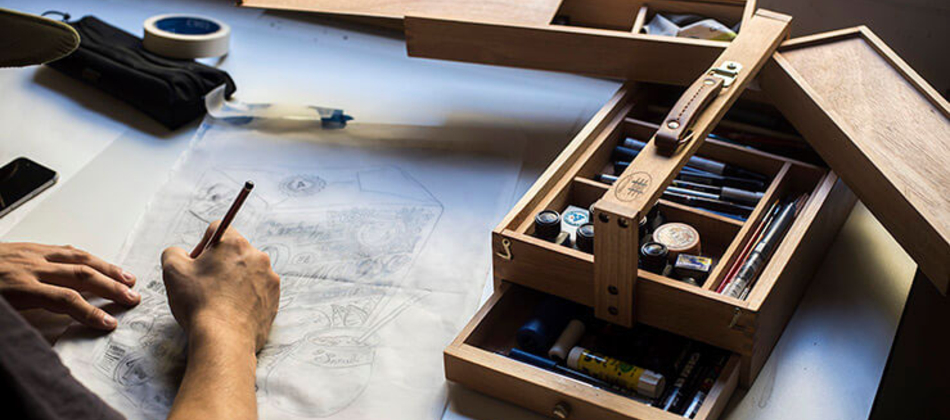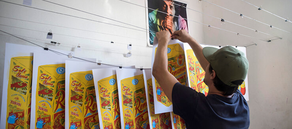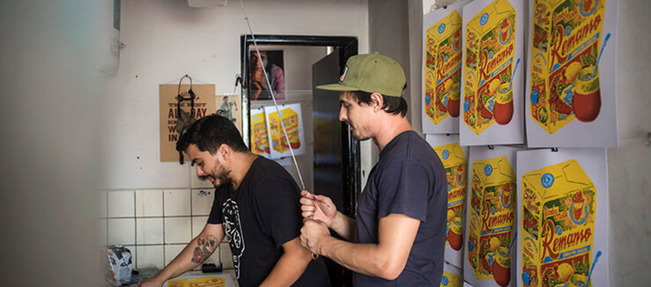Alan cites vintage graphic advertising as his main inspiration. Using a combination of methods derived from screen printing and risograph-making, as well as painting by hand, Alan’s distinctive style is characterised by his homage to lo-fi printing with its errors and limitations. The aesthetics of craftsmanship lifestyles, such as those experienced by fishermen, axmen, butchers and carpenters, feed into his work, as does popular graphic street art.