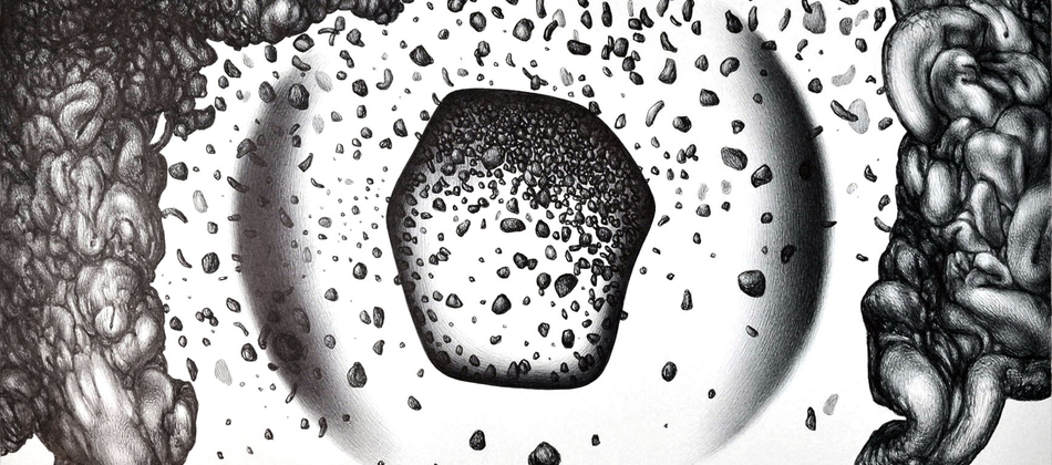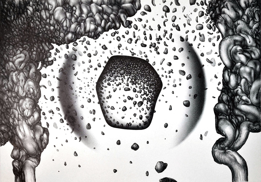 Whilst he has also trained and practiced as a fine art painter, more recently Alberto has focused on the outwardly unassuming ballpoint pen as his main medium. Its often-underestimated characteristics are what draw him to use it; with it one can create areas of subtle shade as if it were stick of graphite, yet also produce areas of dense blackness as deep as pure ink. It also requires discipline and precision, since there is no possibility of erasing marks once they have been created, which adds tension to the act of creating nuance; an unexpected accumulation of ink, if not removed in time, can stain and frustrate the work of a whole day.