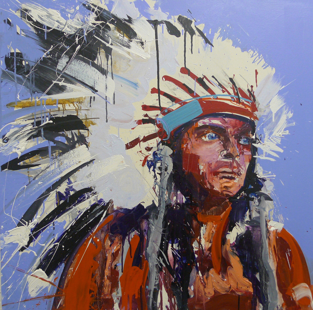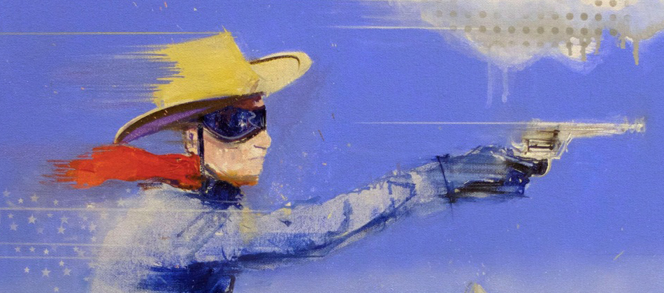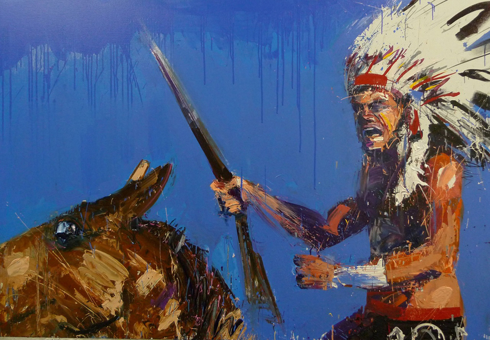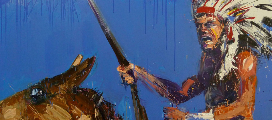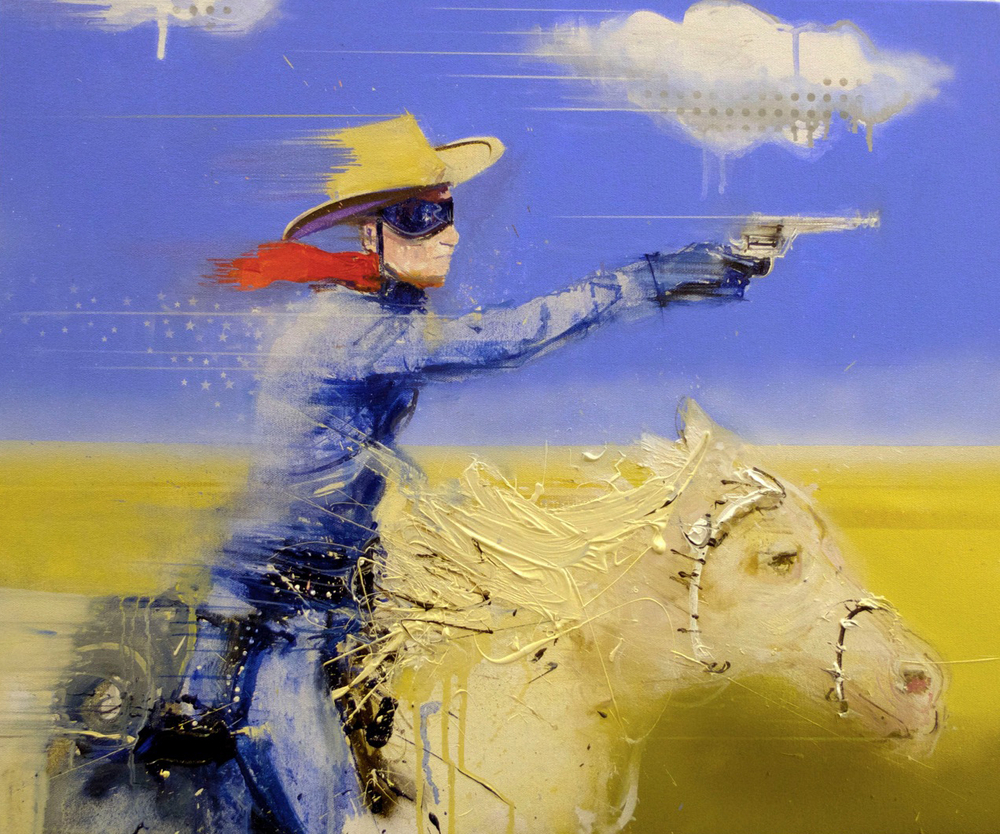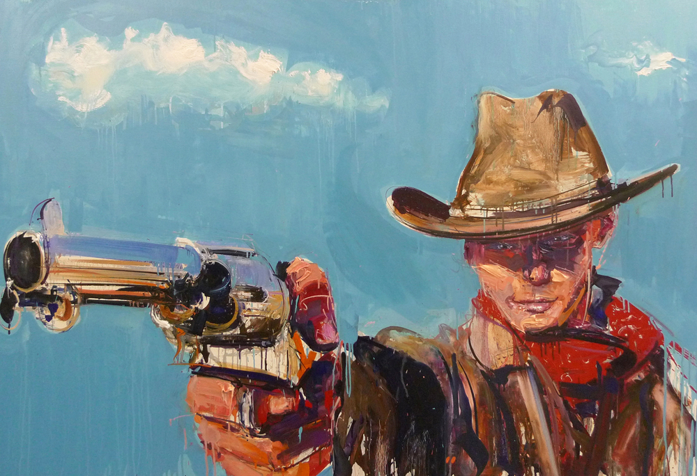 The golden age of the Western movie era is encapsulated in Dave Whites series of Technicolour oil paintings. High energy scenes, dramatic tension and sweeping Western backdrops could be said to be Whites innovative interpretation of the classic film still. The cultural inspiration of this period is evident in the apocalyptic themes of battles and stand offs. The turbulence and explosive movements are animated and presented through chaotic brushstrokes and the continuous energy of an artist dedicated to his own battle with the canvas.