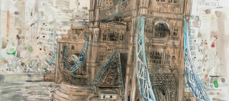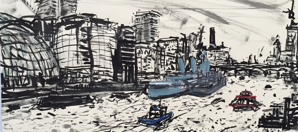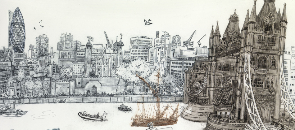 For this exhibition of new drawings and prints of London, Chris was working from a new development from 1Tower Bridge on the South Bank with a sweeping view of the Thames and a spectacular view of Tower Bridge and the Pool of London and looking across the River to the Gherkin and the new ‘Walkie Talkie’ and ‘Cheesegrater’ buildings.