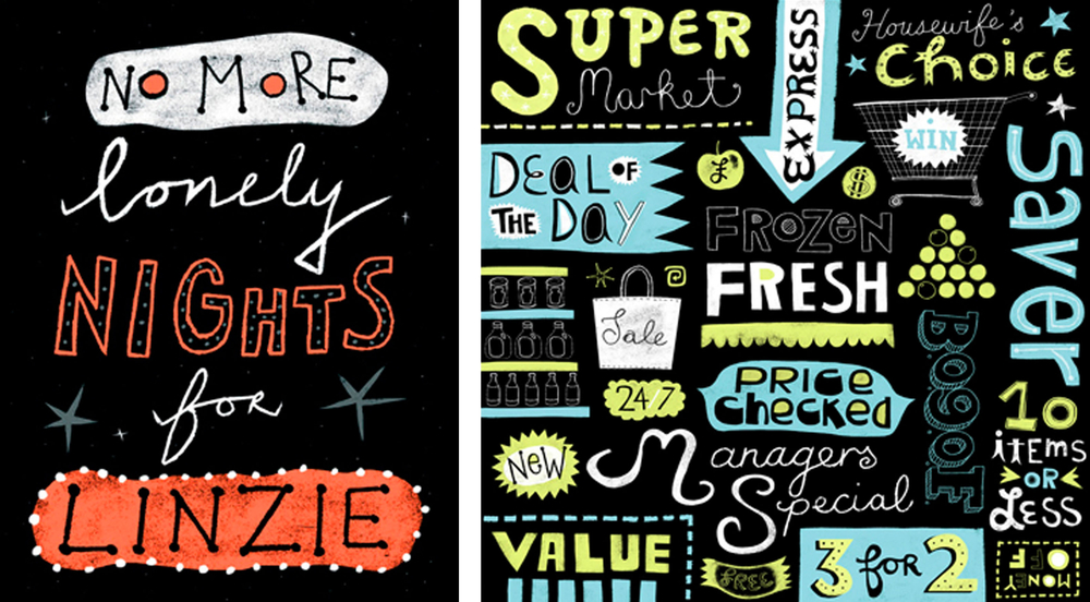 The terrifying Linzie Hunter originated from the barren highlands of Scotland but now resides in a North London suburb where she feasts on worms and grubs whilst working for clients including Random House, BBC, The Guardian & Little Brown. Linzie recently hit the headlines with her lettering work based on the spam e-mails in her inbox. Her book ìSecret Weapon: 30 hand-painted spam postcardsî is published by Chronicle Books in Autumn 2008.