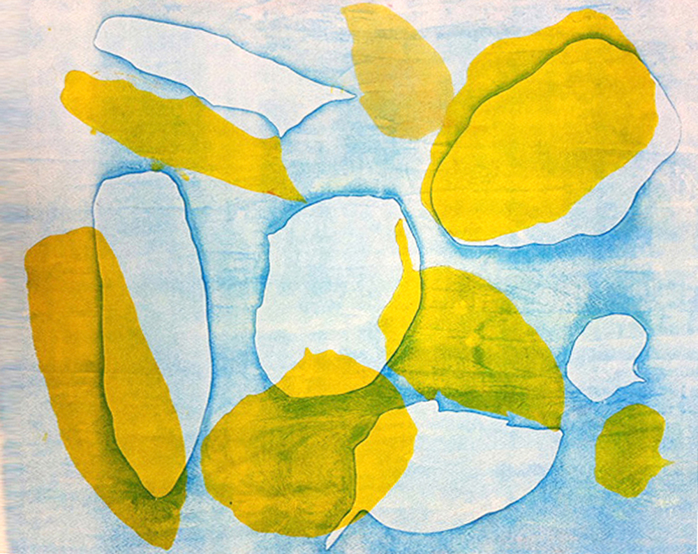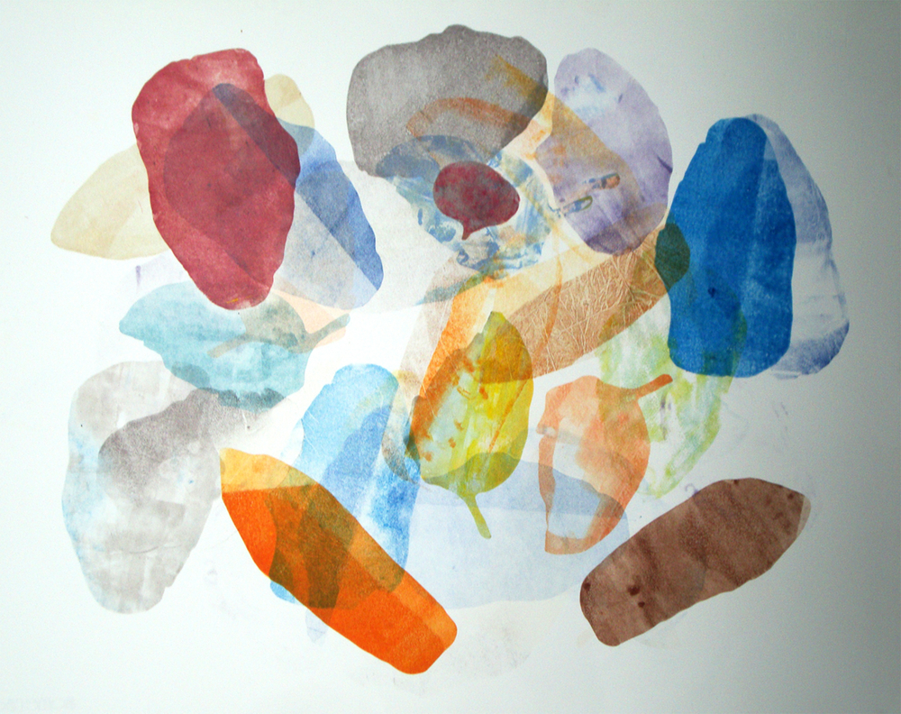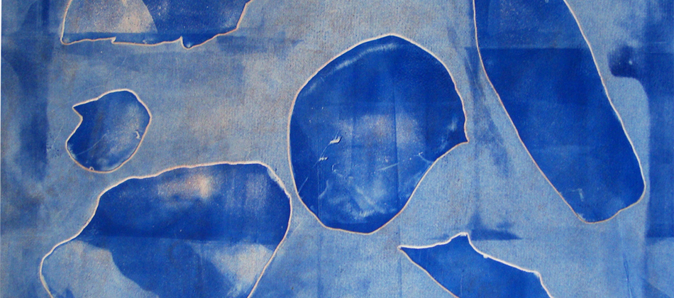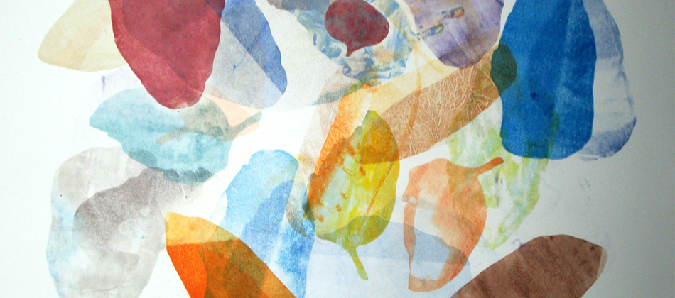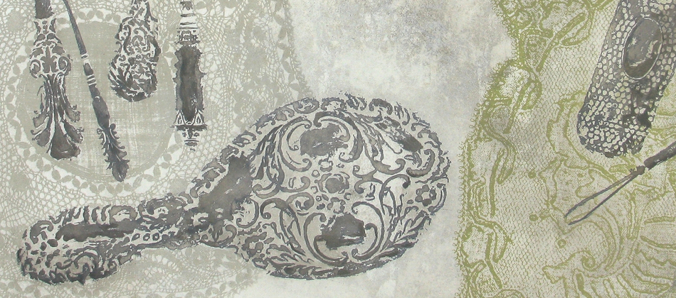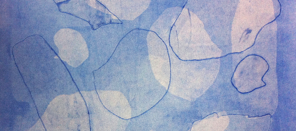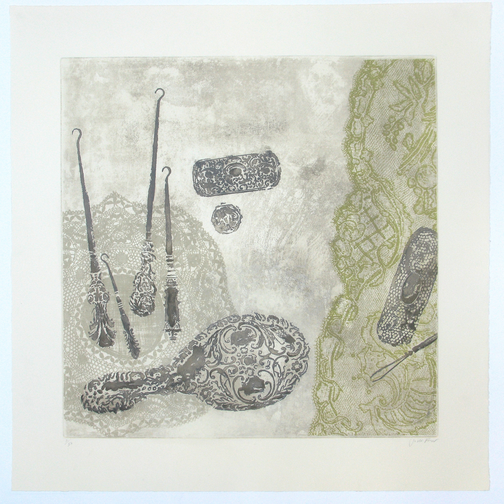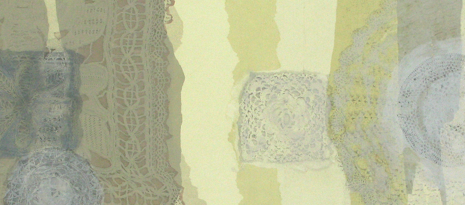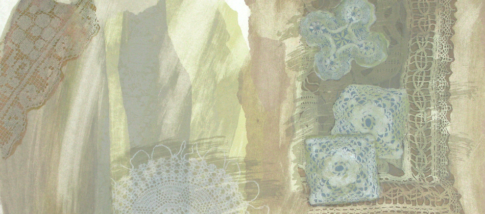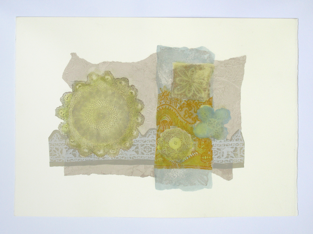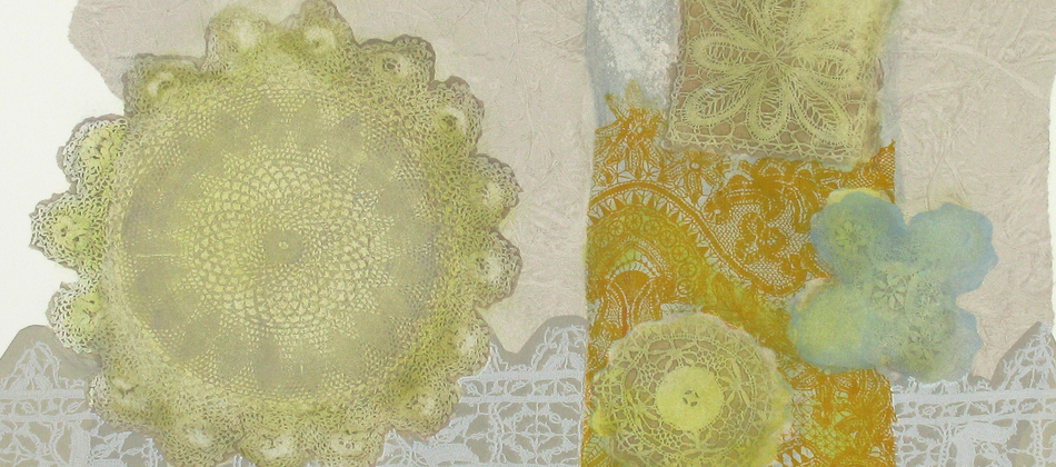 Jo’s work examines the notions of memory and loss. Through the collected detritus of inheritance, her prints are evokative of a bygone era. A topographical homage to hoarding. Her images evolve through a combination of monoprinting, silkscreen, etching and drawing. With subtle layering of the impressions left by old lace and doilies, often obscured through ethereal veils of colour, she builds her imaginary landscapes.