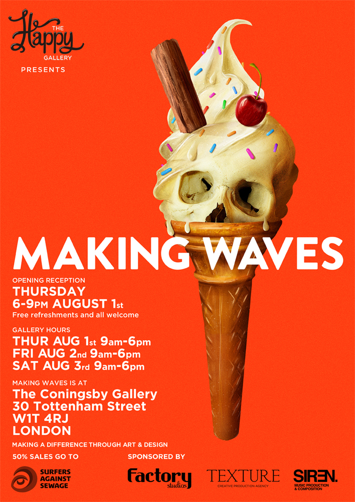 The Happy Gallery Collective’s Exhibition ‘Making Waves’ for Surfers Against Sewage takes place at the Coningsby Gallery Thursday 1st August – Saturday 3rd August 2013. The exhibition is open all day and entry is free. Free drinks will be available at the Open Reception on Thursday from 6pm.