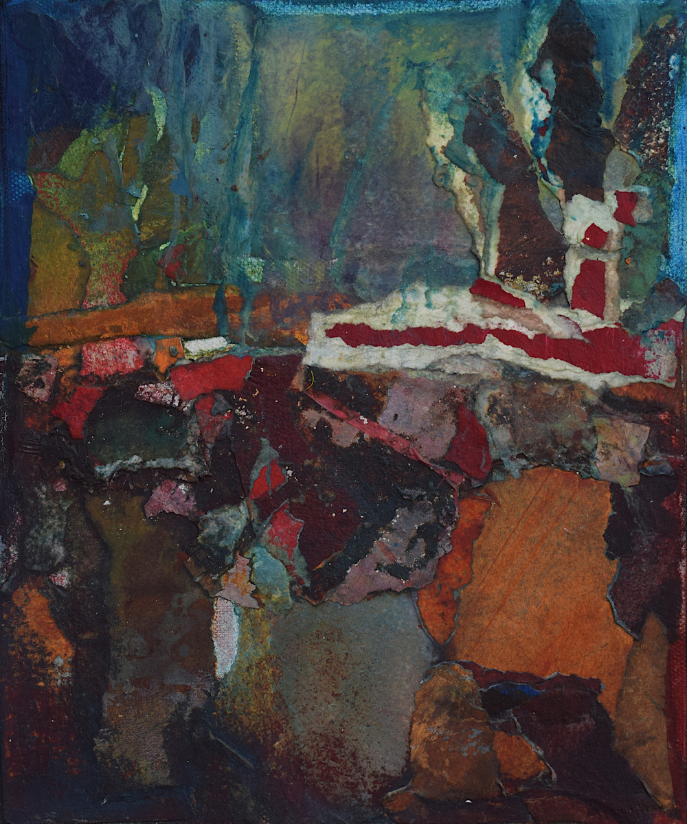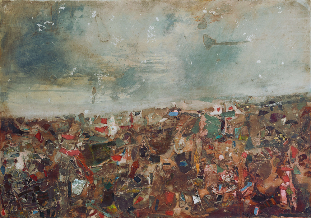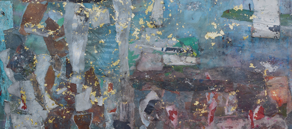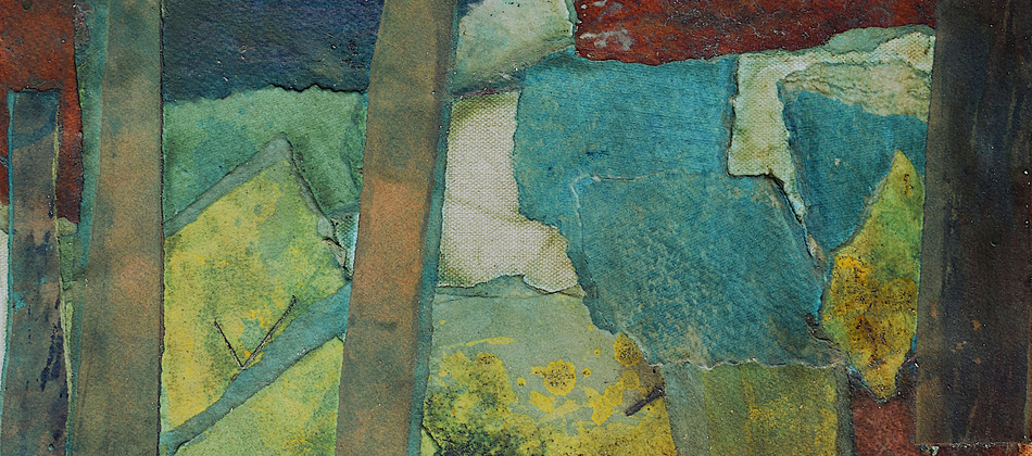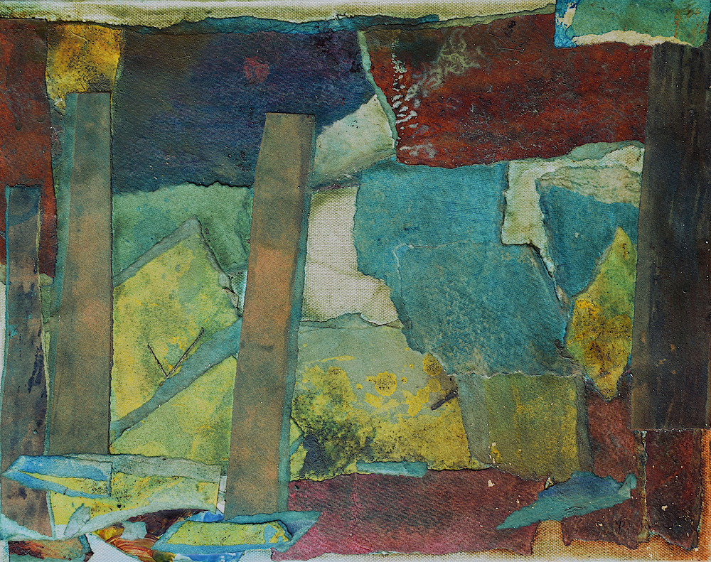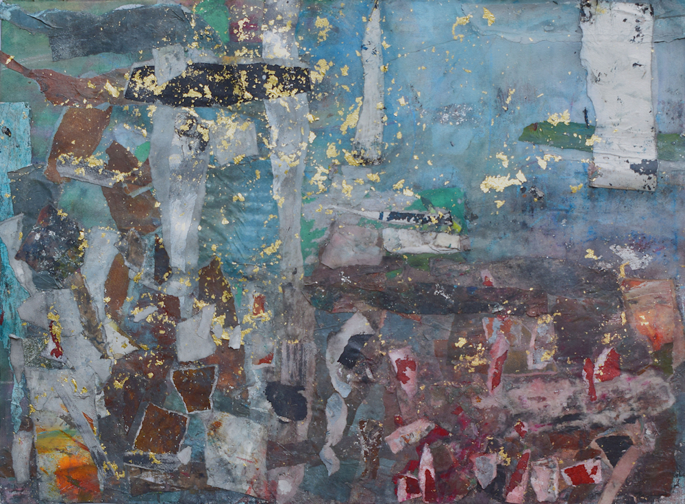 The pandemic changed my work as well as my life. I don’t know why this surprises me. Partly out of expedience, partly out of a need to challenge myself, I decided to rely on what materials I had to hand in my studio. I determined to take unfinished paintings on paper that had accumulated over the years in my plan chest and use them as a source. Like making a mosaic, this new technique involved reassembling the earlier material, adding newly painted elements – this became the most important process – and forging something entirely different and surprising by adding washes and detail with brushes, rollers, rags and mops.