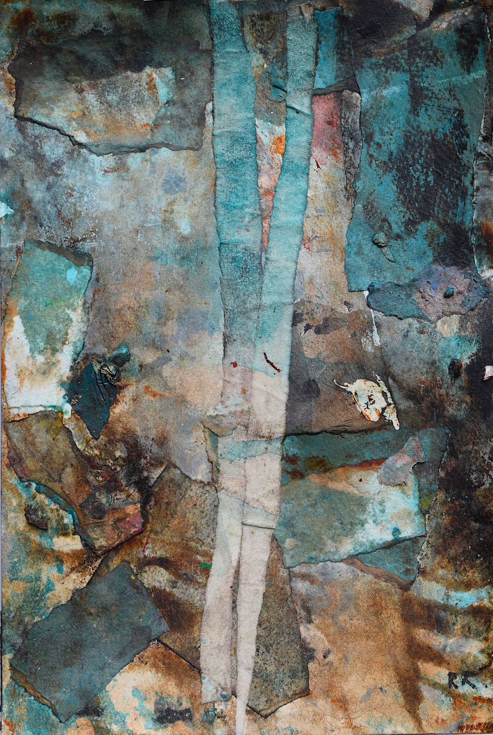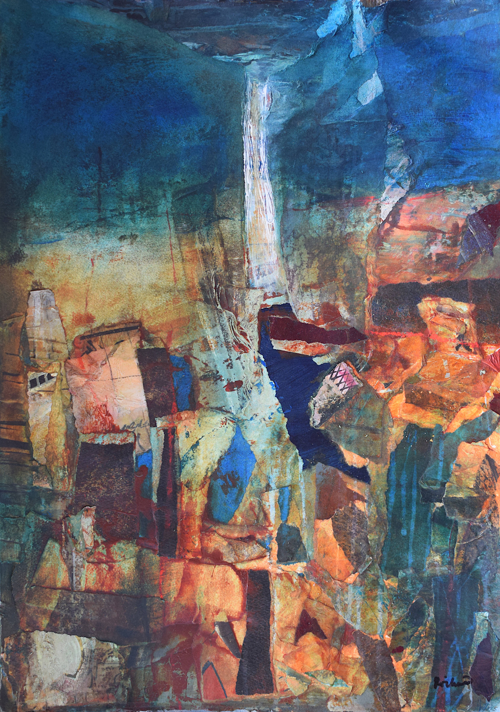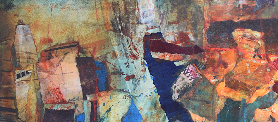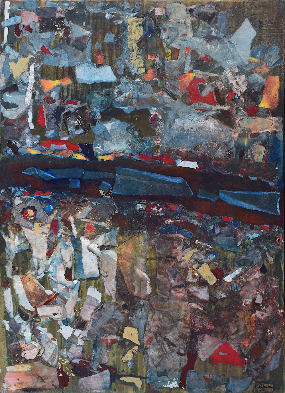 The pandemic changed my work as well as my life. I don’t know why this surprises me. Partly out of expedience, partly out of a need to challenge myself, I decided to rely on what materials I had to hand in my studio. I determined to take unfinished paintings on paper that had accumulated over the years in my plan chest and use them as a source. Like making a mosaic, this new technique involved reassembling the earlier material, adding newly painted elements – this became the most important process – and forging something entirely different and surprising by adding washes and detail with brushes, rollers, rags and mops.