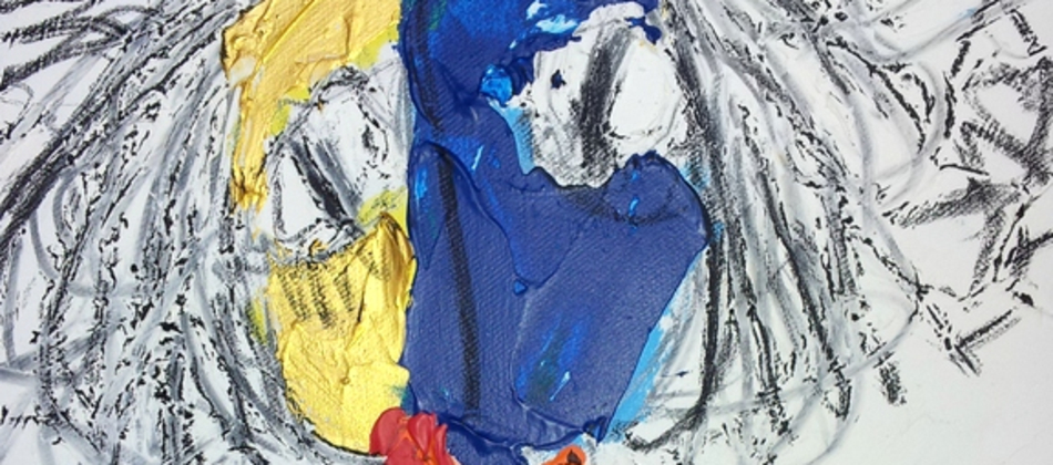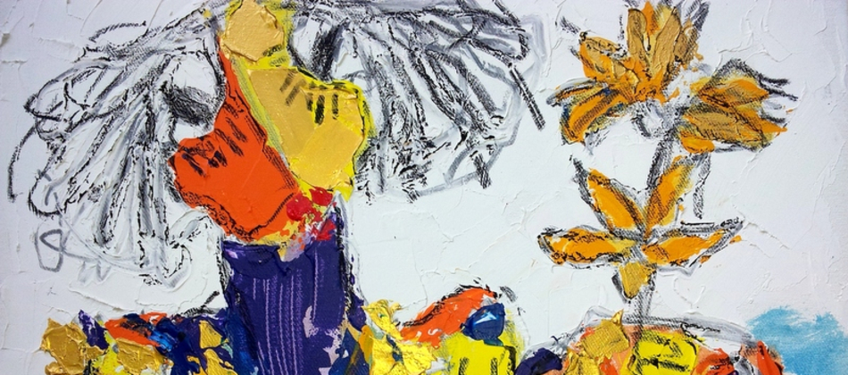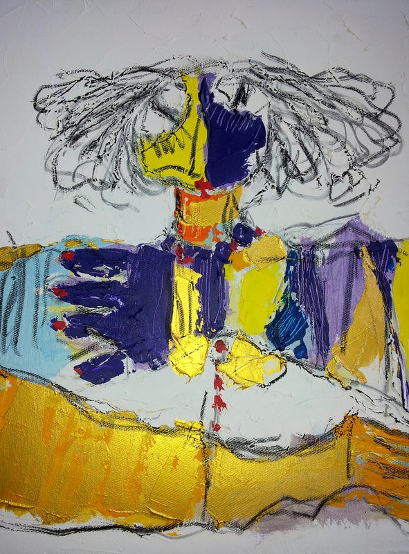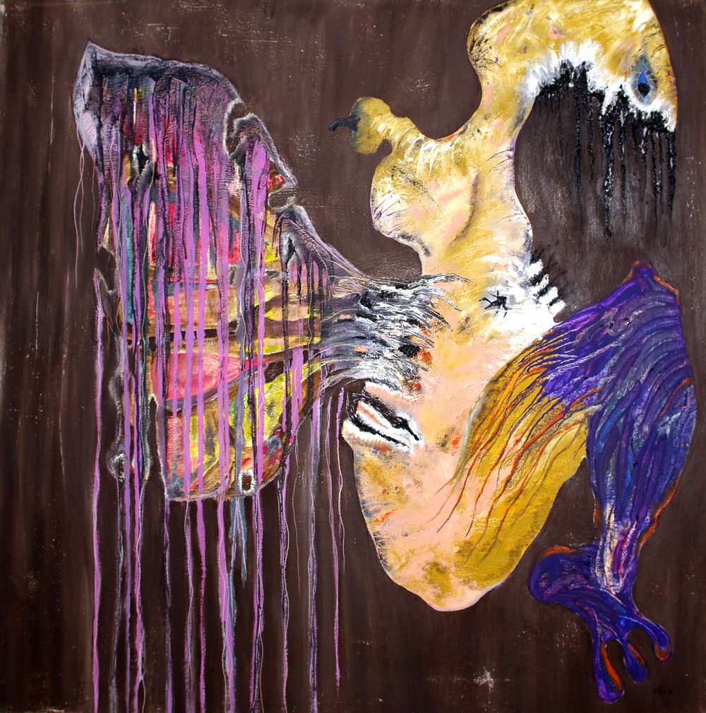 Salah Benjkan Benjkan associates his imagery with the Moroccan youth and the uncertainty surrounding their cultural and political identity. His childlike, somewhat comical creatures are distinctive features in his paintings. These fabulous beings are painted in bright coloured blotches and invade the white textured canvases. At first glance his playful depictions seem joyous and light hearted; at further exploration one notices a sense of melancholy. The figures are removed from reality, waiting for their destiny.