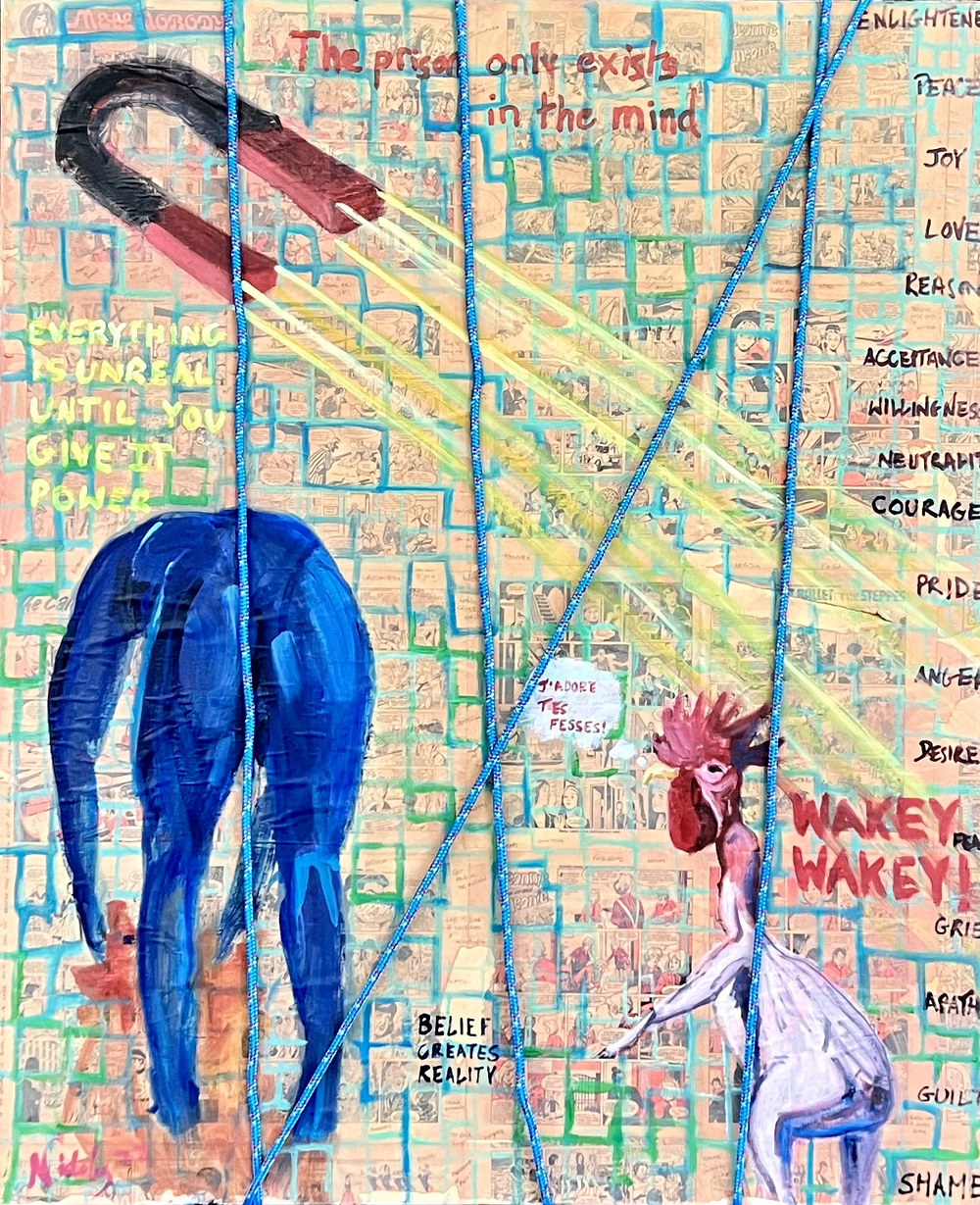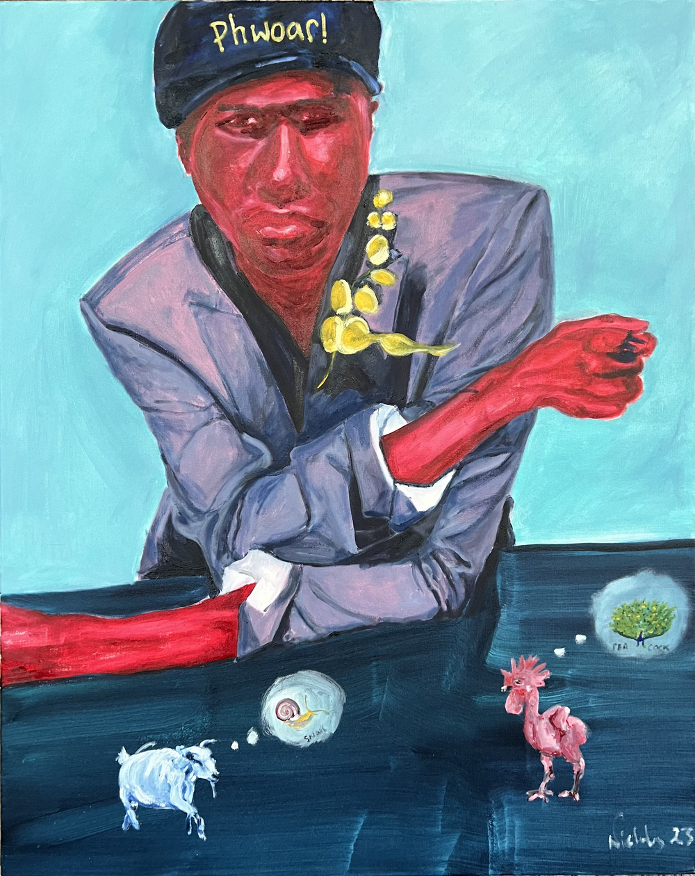 Each piece explores a different subject matter and within these contexts, the relationship between ego and creative genius feature prominently, the former represented by the goat, and the latter represented by the featherless rooster. Our ego references our past and serves to keep us safe, yet it can also prevent our growth and full potential (our genius), which knows no bounds.