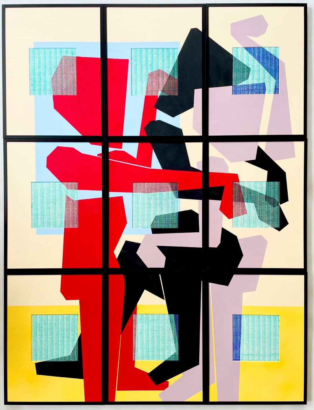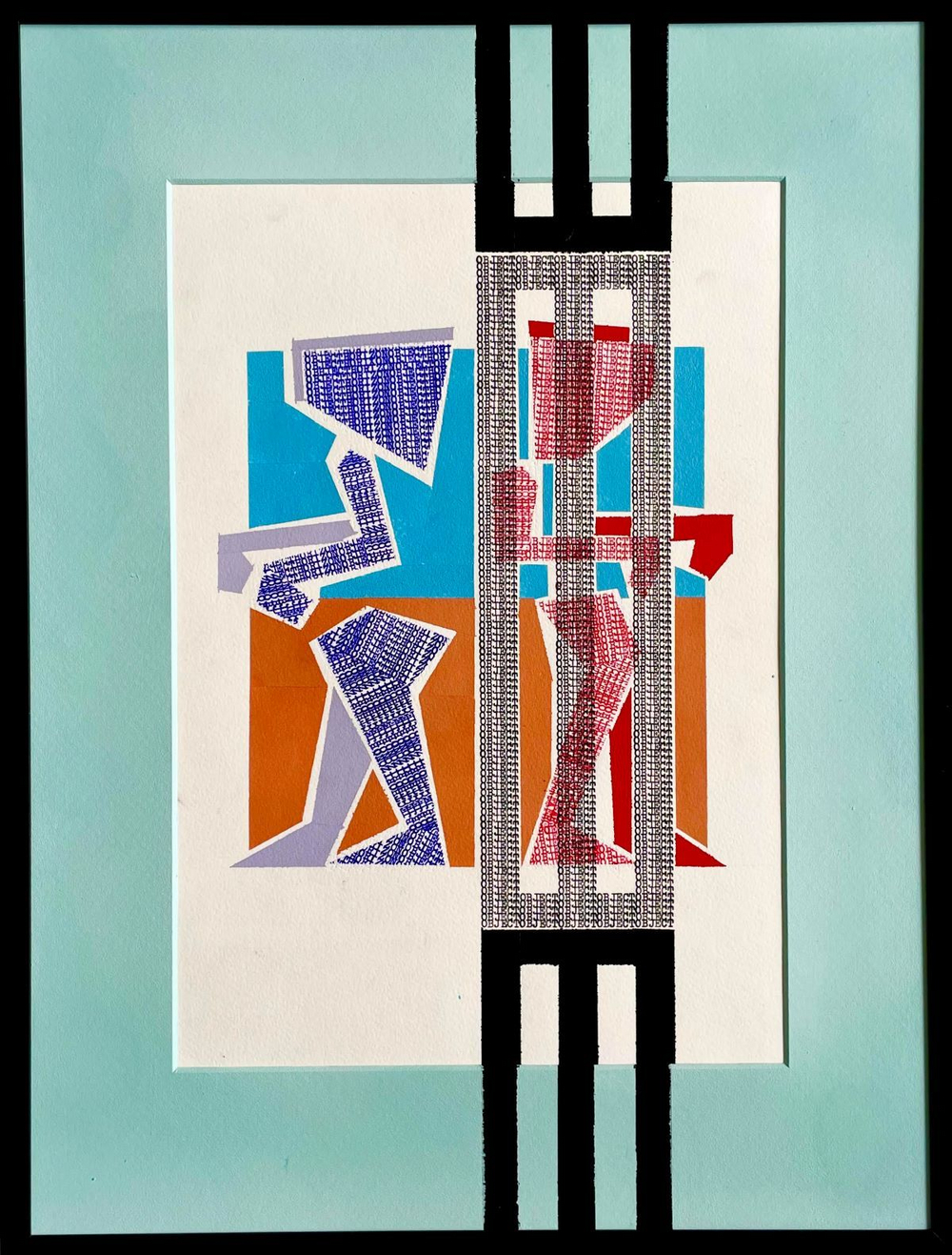 In the foreground of the triptych stand a group of entwined graphic figures caught in an ambiguous physical embrace. They are set against a backdrop of colour and words that appear to be commenting on the events before them. This juxtaposition expresses the uneasy relationship between participation and objectification inherent in the human condition.