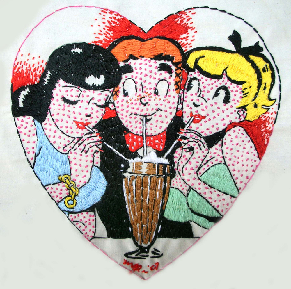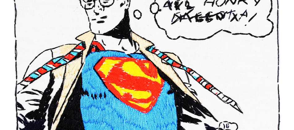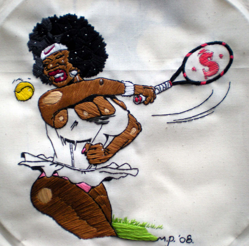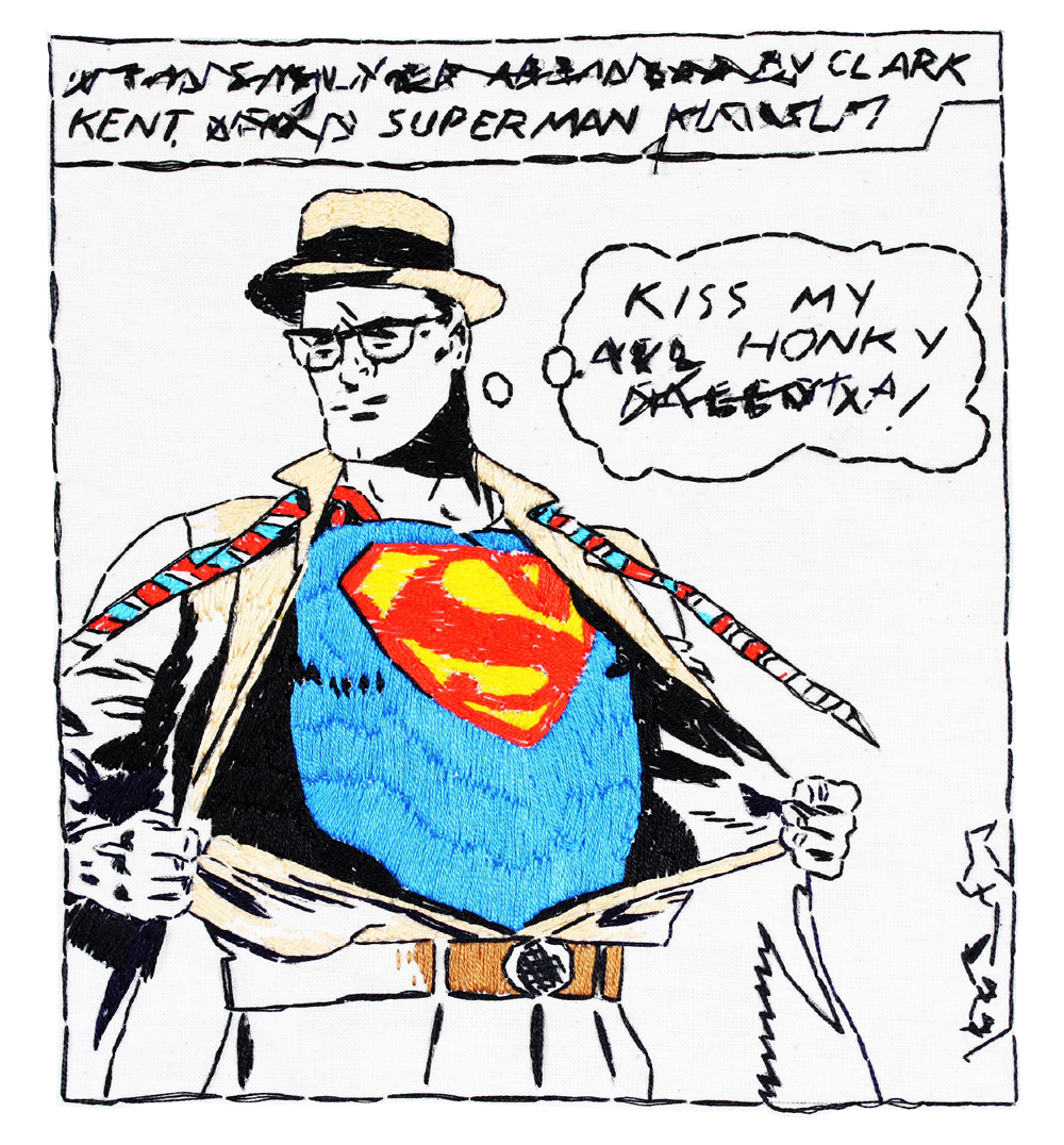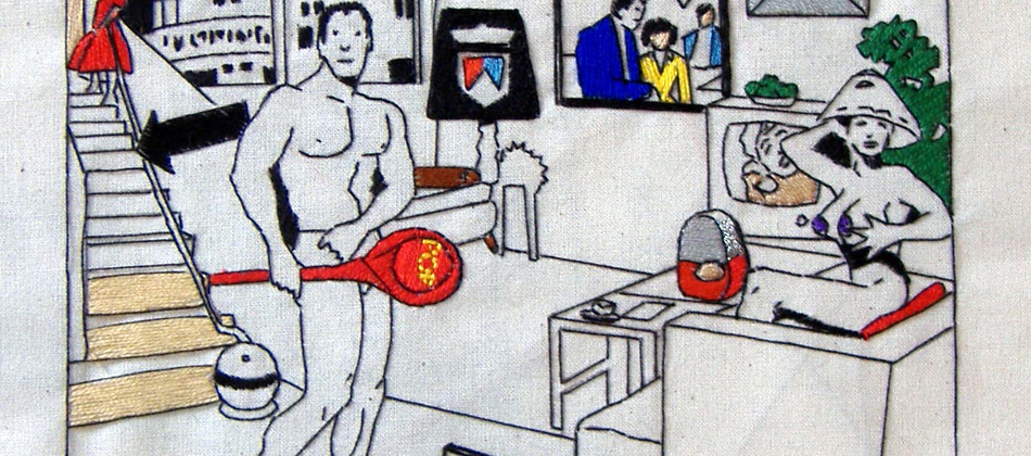 Malcolm Poynter’s pop art style employs the use of comics, cowboys, pin-ups, toys and cheap advertising to freshen up and elevate needlework for a more contemporary art market. His dual passion for Van Gogh artworks and Eagle magazine could attribute to his present style, which combines nude women and comic books.