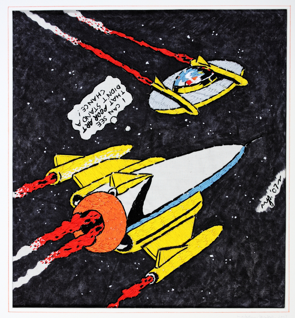 “Cushions are kids stuff. My embroideries are going where no embroideries have gone before…They are rough and tough and full of spunk!” Malcolm Poynter.